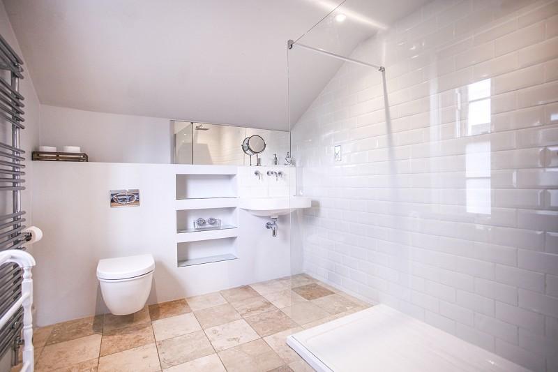 Three piece suite in white. Pedestal wash hand basin, low flush w.c., panelled bath with hand-held shower attachment. Velux window. Chrome ladder-style heated towel rail and radiator. Dressing mirror.