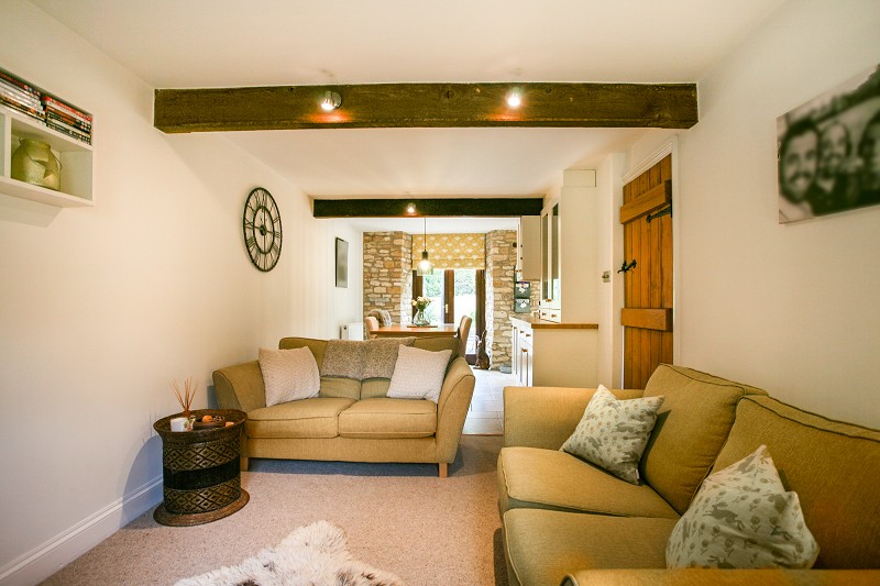 The main section of the cottage has a through living and dining area, formed in part open-plan with the stylishly re-fitted kitchen, with limestone style flooring, solid beech worktops, and a range of stylish fitted cupboards and built-in appliances. Double doors from the dining area open onto the beautifully presented and well-screened south-facing garden.