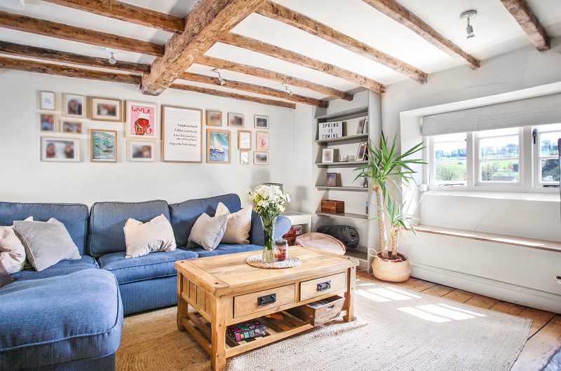 Stained timber flooring, exposed beams and batons to the ceiling. Inglenook fireplace with cast iron woodburning stove set on flagged hearth. Built-in window seat with south easterly aspect over rear garden. Double radiator. Built-in shelves to one side of window.