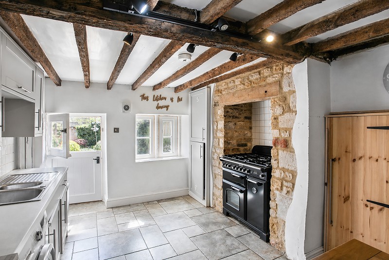 Ceramic tiled floor. Rangemaster five ring stove set in to original chimney breast with oak lintel above and trimmed with Cotswold stone. Laminate work tops to one wall. Four base cupboards, seven matching wall-mounted cupboards. Tiled surround to work surfaces. Space and plumbing for dishwasher and automatic washer. Double radiator. Built-in gas meter cupboard. Two-tier cupboard housing gas fired central heating boiler. Mullion window with outlook over garden. Stable-style back door.