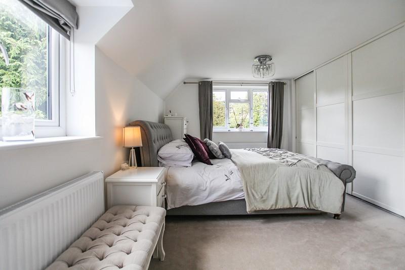 With bank of full height wardrobes with sliding mirrored doors, single radiator with cabinet surround and attractive outlook over gardens and treescapes to the front, louvred blinds.