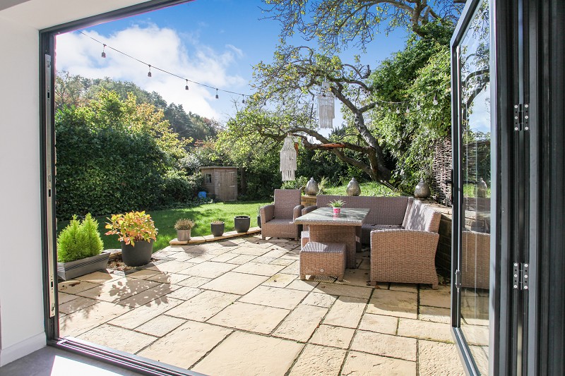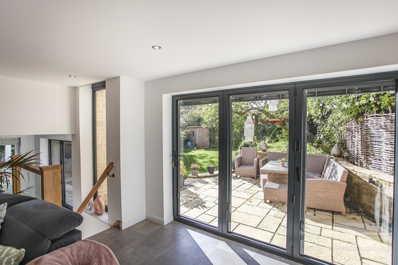 With ample space for dining table and tri-fold doors forming a picture window southerly aspect over well-screened rear garden, with integrated blinds.