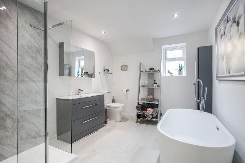 With four piece suite in white, with oval free-standing bath, wash hand basin set onto double cabinet, low flush WC and walk-in shower cubicle with folding glazed door, rain shower head and hand-held shower spray. Ladder-style heated towel rail and radiator, high-level skylight window.