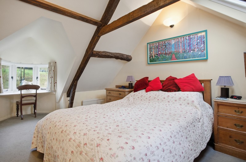 With exposed purlins and a-frame roof timbers. Southerly facing bay window to the rear and northerly facing dormer window opposite. Two double radiators and double glazed velux swing window. Wall mounted light point. Double and single built in wardrobes, easterly aspected window with outlook over gardens and countryside. Double built in cupboard into eaves.