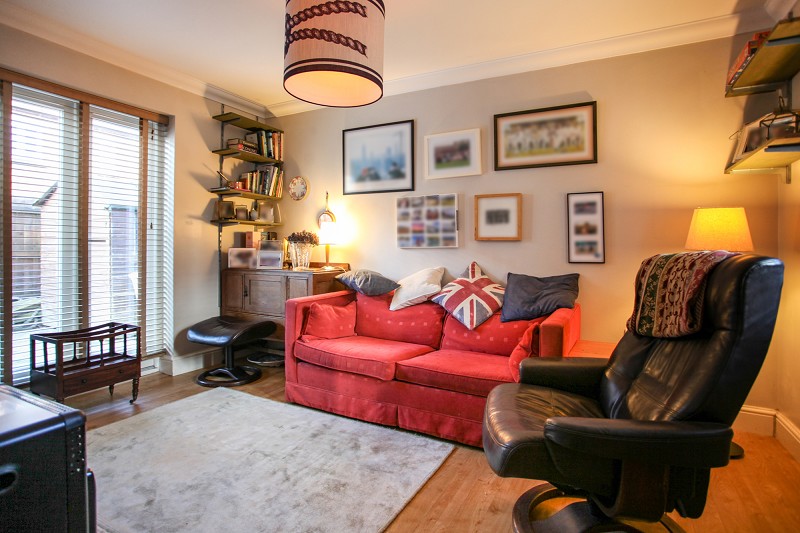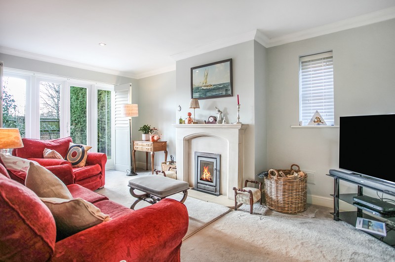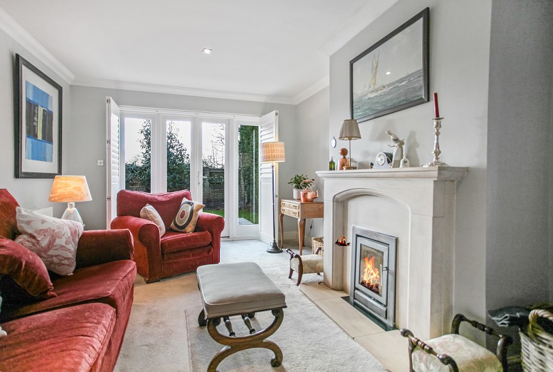 Thomas Sanderson folding louvred doors with westerly aspected French doors leading on to rear garden. Fashionable soap stone fireplace with integrated logburner. Two double radiators and cornice moulded ceiling.