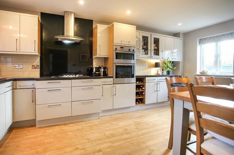 Fitted on two sides with granite-style laminate work tops with inset 1 1/2 asterite sink unit with single drainer and hose-style mixer tap. Split-level fridge with freezer below, integrated dishwasher, two three-tier pan drawers, seven base cupboards, seven matching wall-mounted cupboards two with glazed cabinet display fronts. Split-level Bosch electric double oven and five ring Bosch gas hob, granite-style splashback with canopied charcoal filtered cooker hood above. Integrated twelve bottle wine rack. Double radiator, oak-style Karndean flooring. Eight inset spotlights to the ceiling.