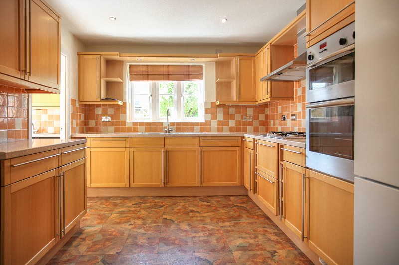 Fitted on three sides with laminate worktops, inset 1 1/2 stainless steel sink unit with single drainer and mixer tap. Integrated dishwasher, split level Bosch double oven and five ring stainless steel split level Bosch hob with double width canopied cooker hood above. Eight bottle wine rack, two large pan drawers and eight further base cupboards. Seven matching wall mounted cupboards. Liebherr fridge and freezer in built in surround. Double radiator.