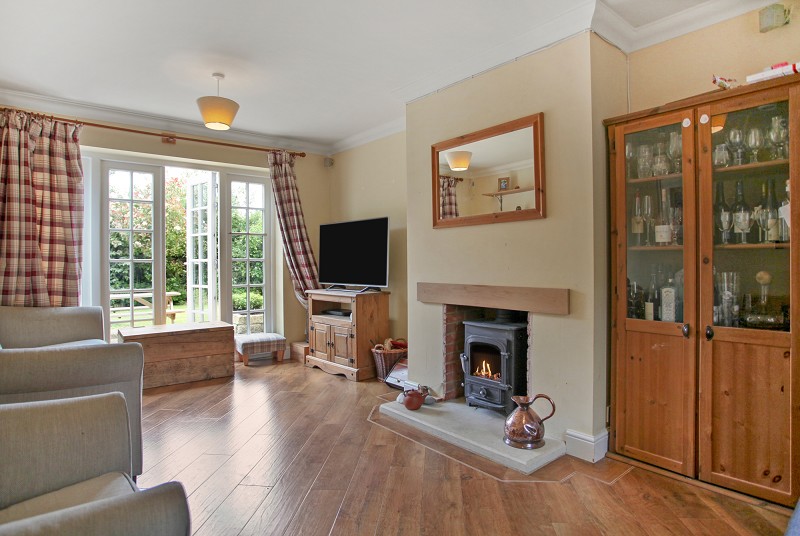 Two double radiators and small paned double glazed French doors with south easterly aspect over the garden. TV aerial point, cornice moulded ceiling.