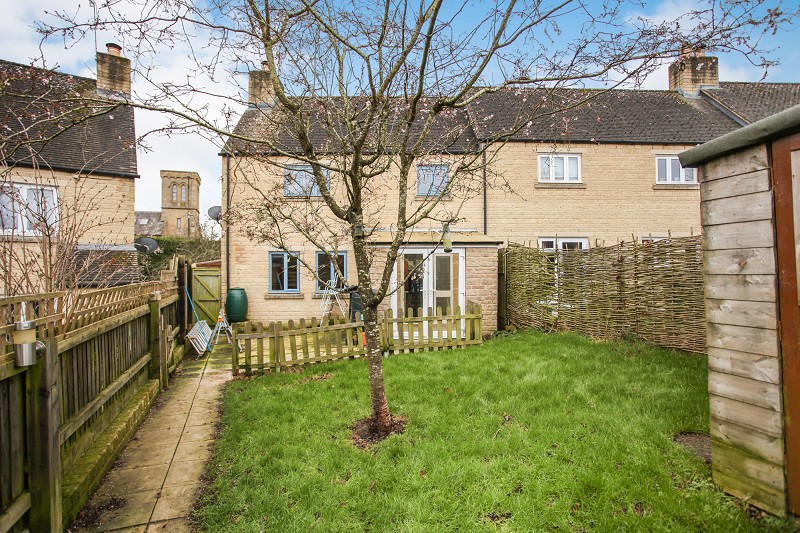 L-shaped lawned area bounded by random Cotswold stone wall and patio immediately adjacent to the property. Picket gate leading to pathway.