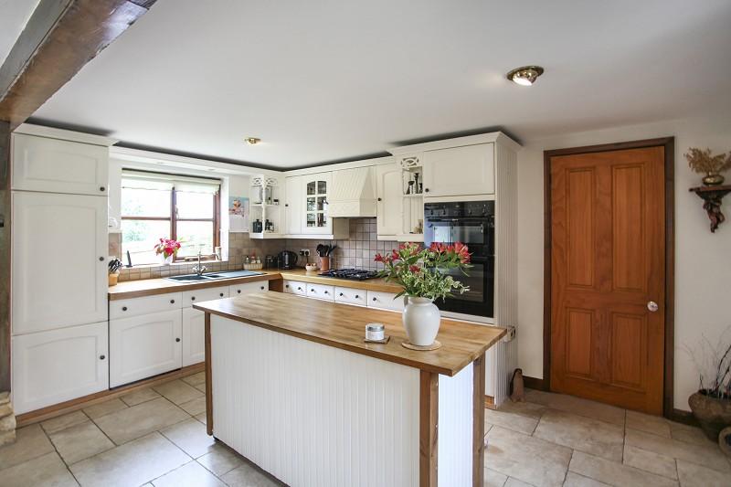 Fitted on two sides with parquet-style oak worktops with central oak topped podium. Split-level propane gas hob with externally ducted canopied cooker hood above, built-in Xpelair to one side. Concealed pelmet lighting, split-level Neff oven and hob. Split-level fridge with cupboards above and below, integrated dishwasher. Seven further base cupboards and four matching wall-mounted cupboards, one with glazed cabinet display front. Tiled surround to work surfaces, central podium with three integral cupboards. Ceramic tiled floor with electric underfloor heating with two zones, stable-style back door.