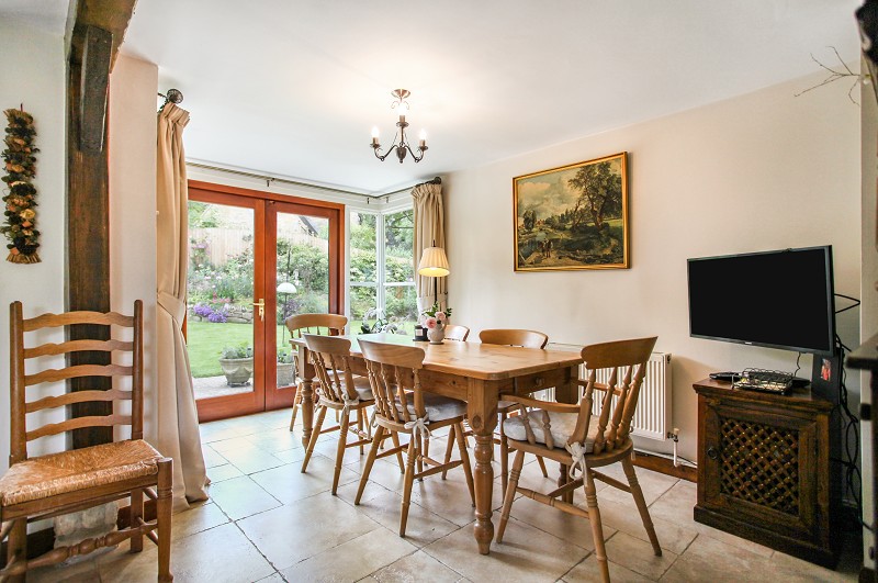 The property promotes a distinctly cottage feel with a stone flagged entrance hall, an inglenook fireplace with a homely woodburning stove in the living room and an open-plan kitchen and dining area. There are three double French doors opening on to the stunning enclosed south-facing rear garden tended with care over many years by the present owner to whom the garden pays the highest compliment.
