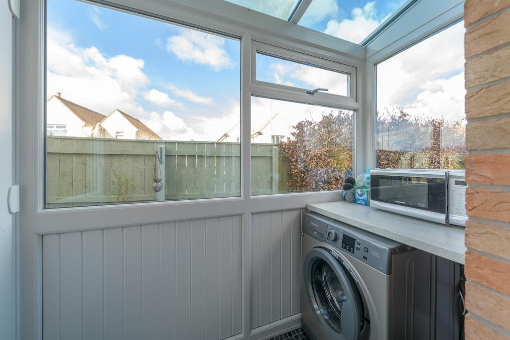 The well-equipped kitchen offers plenty of wall and base units with a solid wood door and wood-look interiors complemented by a granite-effect work surface and attractive brick-style splashback tiling capturing pale pastel hues. In terms of fitted equipment, there is a single bowl stainless steel sink, an under bench electric oven, a four-burner Samsung induction hob beneath a built-in extractor fan, a drawer pack and a slimline fully integrated dishwasher. There is space for a free-standing fridge-freezer. A window overlooks the rear garden and bench lighting creates a lovely effect as the evening approaches. A uPVC door provides access to a conservatory style porch where there is further bench space and plumbing and space for a washing machine. A uPVC door opens to the rear garden.