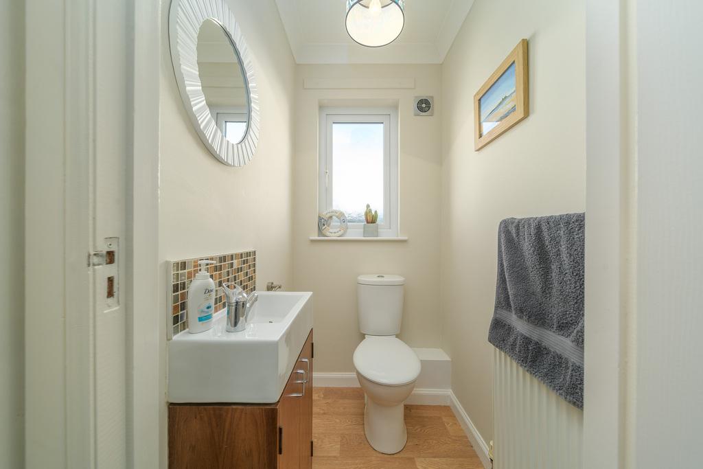 The ground floor WC, accessed from the hallway, comprises a close-coupled toilet with a push button and an attractive vanity unit with a sink on top and a glass mosaic splashback behind. The space has been finished with wood-look flooring and a window allows for natural light. Adjacent is a good-sized storage cupboard beneath the stairs and a further door, at the foot of the stairs, provides useful access to the integral single garage, with sockets and lighting, which has been well finished presenting good storage in addition to independent external access to the side of the property.