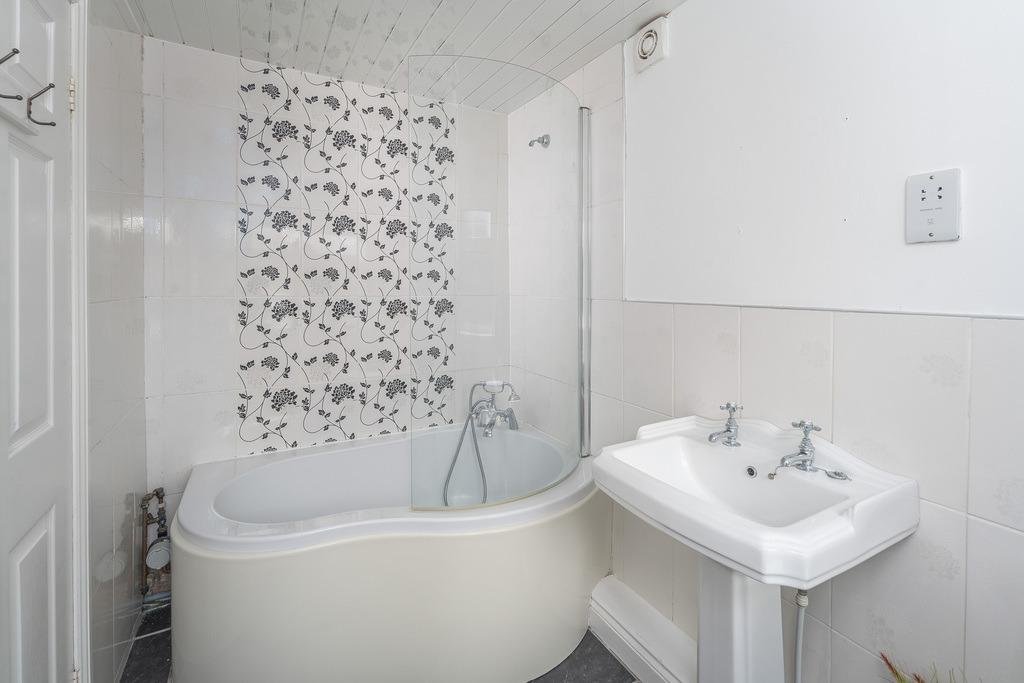 The bathroom, adjacent to the kitchen, comprises a P shaped bath with a shower over behind a curved shower screen, a pedestal hand wash basin and a close coupled toilet. A radiator ensures added comfort. The space is attractively tiled extending to full height around the bath and shower area and the low maintenance ceiling with a central light completes the crisp and fresh look. The dark grey tiled floor continues from the kitchen creating continuity between the different spaces.