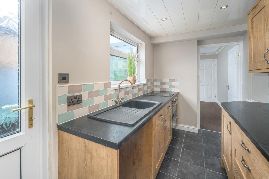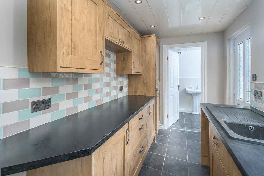 Located to the rear of the property, the galley style kitchen offers plenty of wall and base units with a rustic oak effect door with brushed iron-coloured furniture complemented by laminate charcoal grey work surfaces and splash back tiling in tones of aqua, beige and ivory which create a restful feel and work in harmony with the grey colour scheme throughout the property. In terms of fitted equipment, there is a fridge-freezer, a single bowl stainless steel sink with a drainer and a mixer tap, a Zanussi four ring induction hob beneath a chimney style extractor fan and a CDA electric double oven. The work surface extends to provide further seating, a large window overlooking the rear allows plenty of natural light to enter and a uPVC partially glazed door provides external access to the rear courtyard. The low maintenance ceiling incorporating spotlights adds brightness.