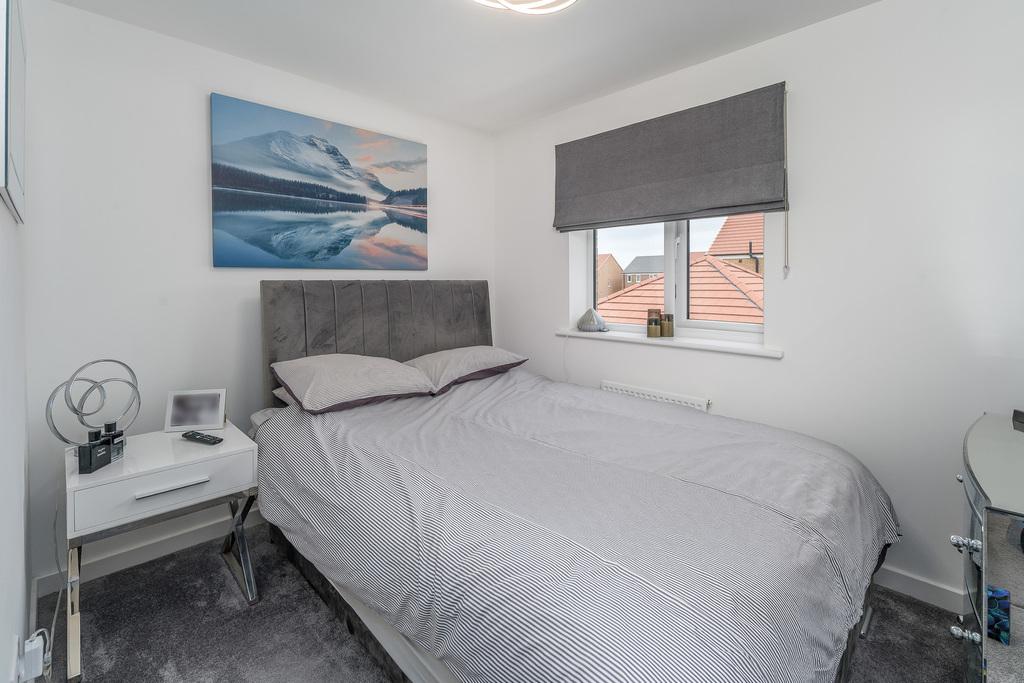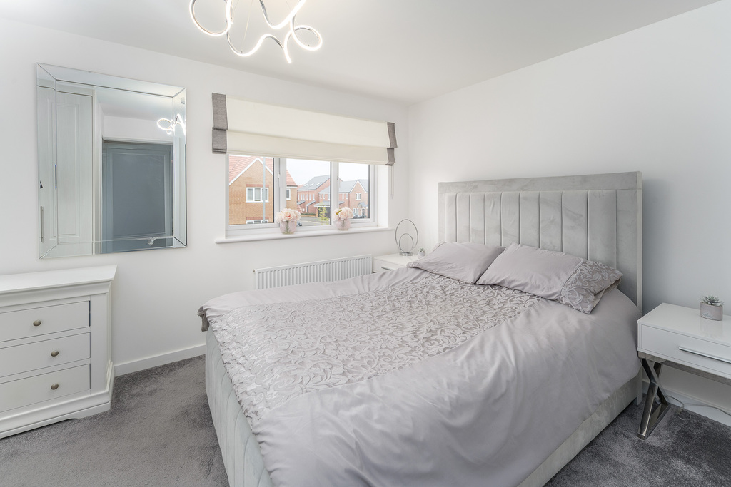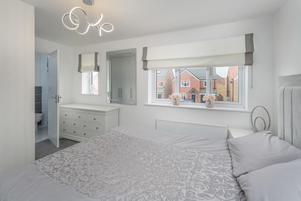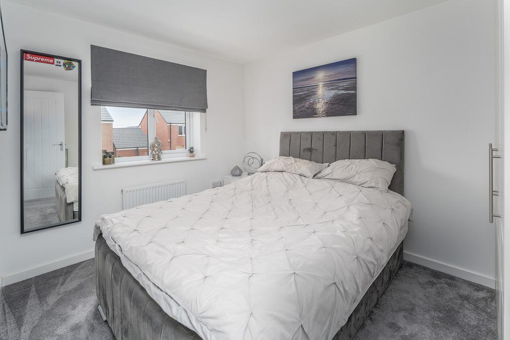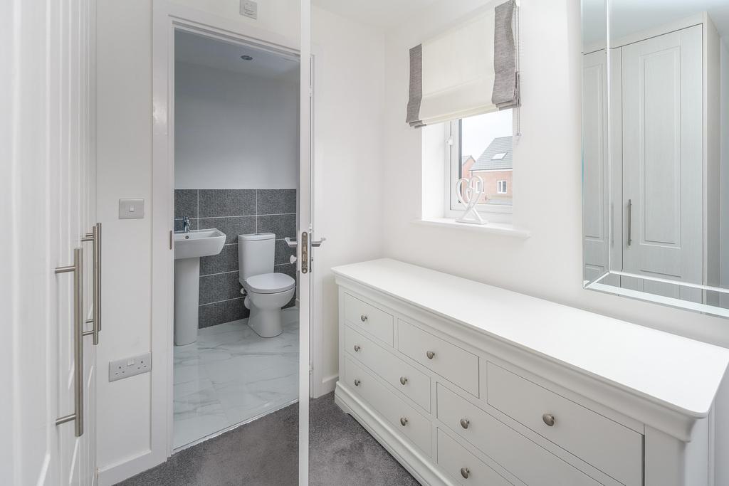 The primary bedroom is a large king-sized room with two windows taking advantage of views to the front of the property. This room offers a built-in wardrobe, a wall mounted television bracket and benefits from an ensuite shower room. The suite comprises a fully tiled shower area with a double sized cubicle and shower within, a grey painted heated towel rail, a pedestal wash hand basin and a close coupled toilet with a push button behind. A window, with privacy glass, allows for natural light which illuminates the stunning marble-look floor tiles, creating continuity from the ground floor and working in harmony with the slightly darker marble-effect wall tiles.