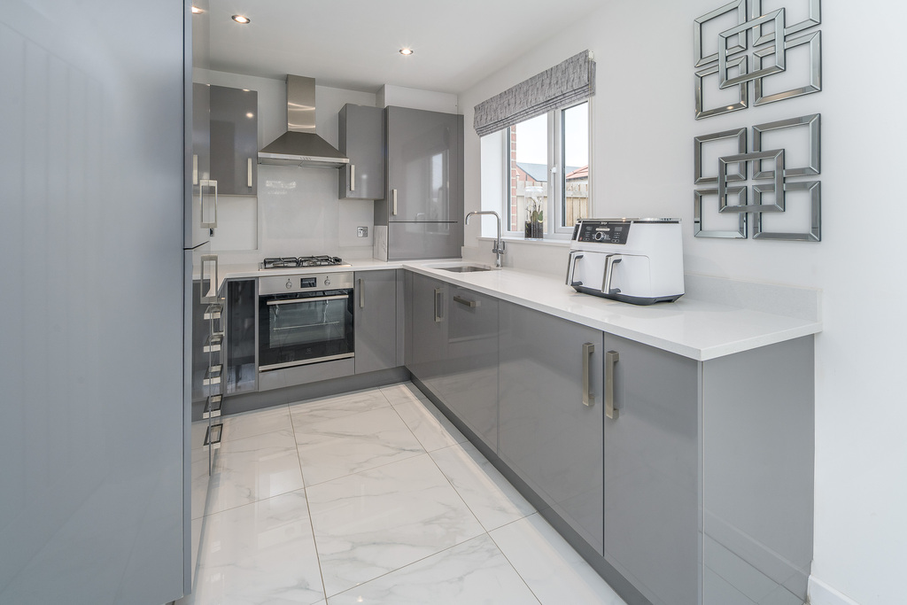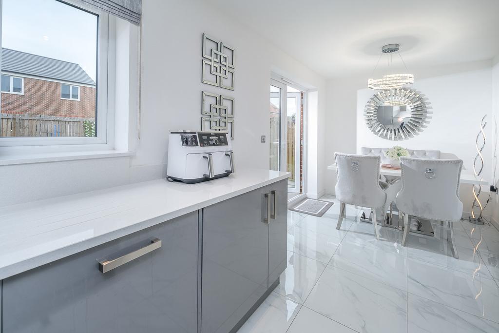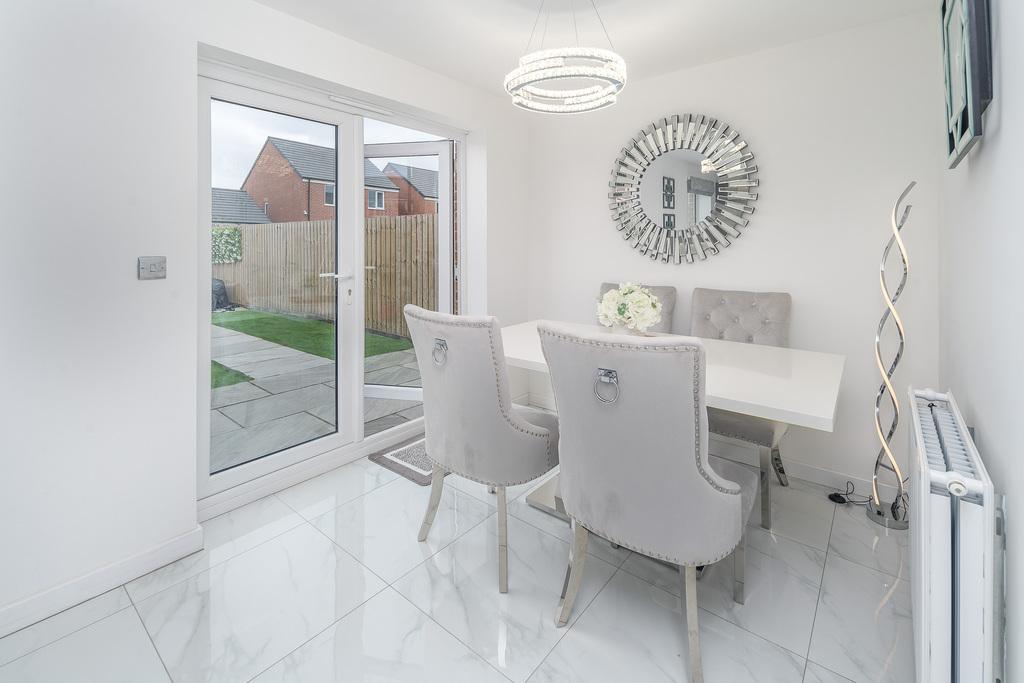 Bathed in natural light courtesy of a window overlooking the front of the property, the lounge is an inviting and spacious room allowing an amount of flexibility when arranging furniture and plenty of space to comfortably accommodate a large settee. This is a superb space in which you can relax with family and friends. From here, a door opens to the main hallway with stairs leading to the first floor, access to the kitchen-dining room, and entry to the ground floor WC, which is beneficial as it negates the need to continually frequent the upstairs facilities. The suite comprises a close coupled toilet with a push button behind, a chrome heated towel rail and a wall hung hand wash basin. The flooring downstairs from this point onwards is exquisite; large marble-look tiles which delicately reflect the light creating a stunning look which continues into the kitchen-diner.