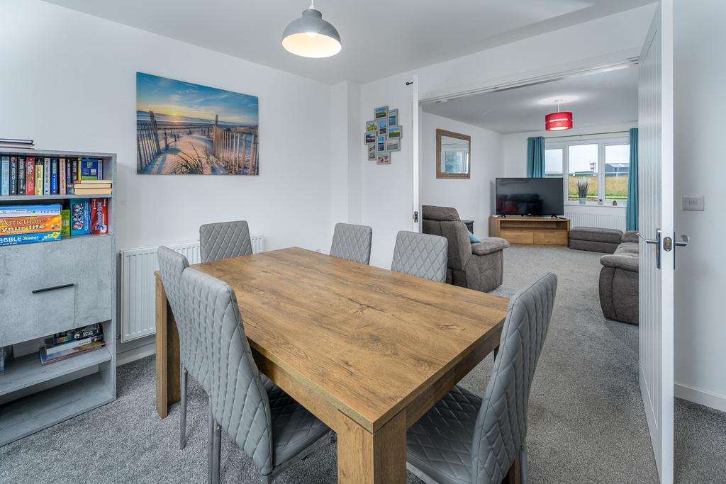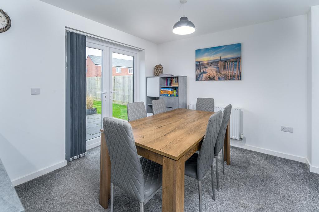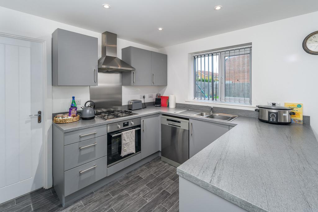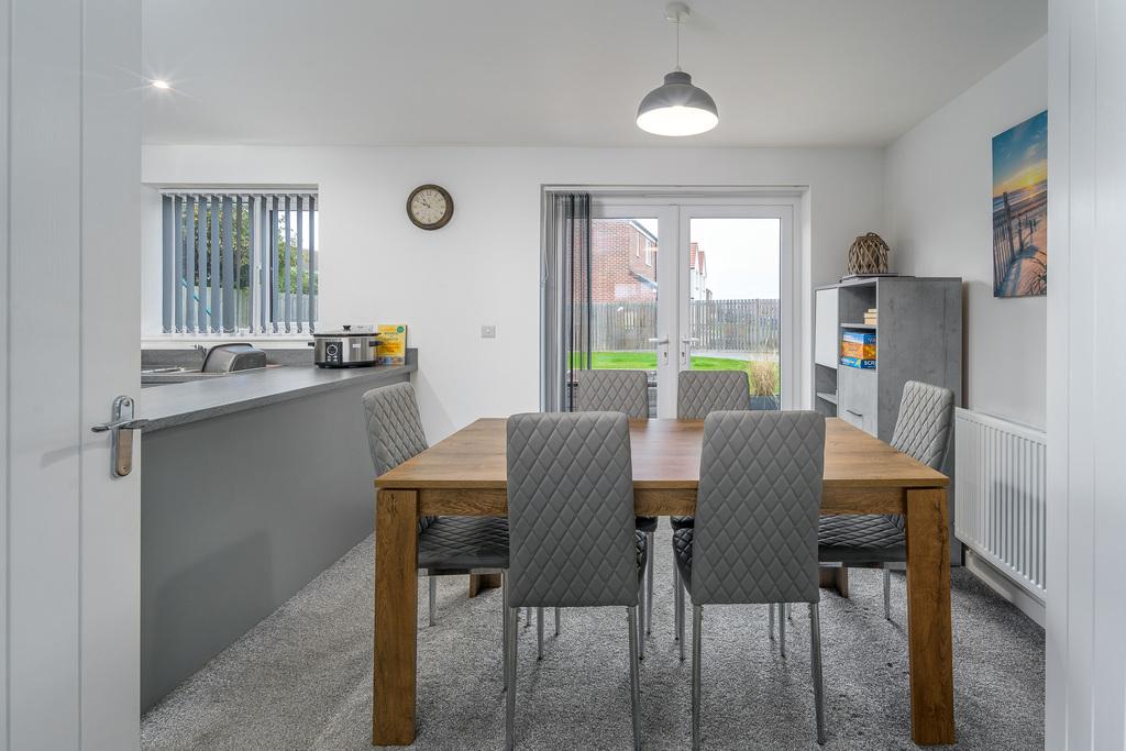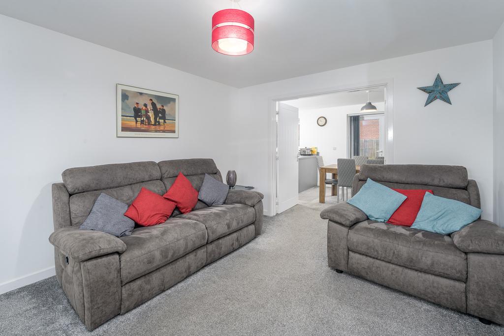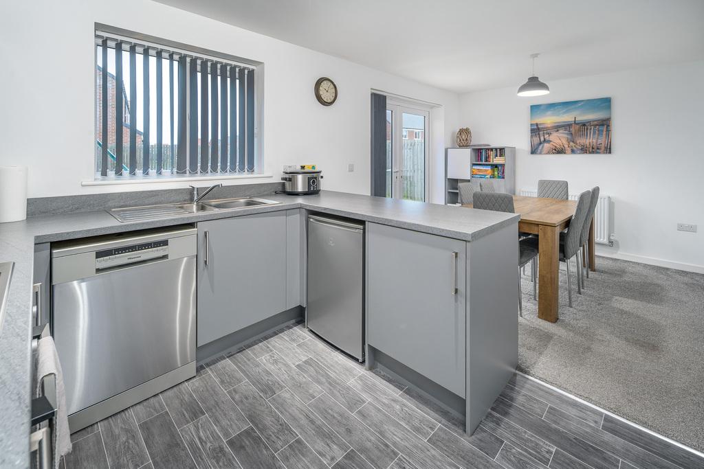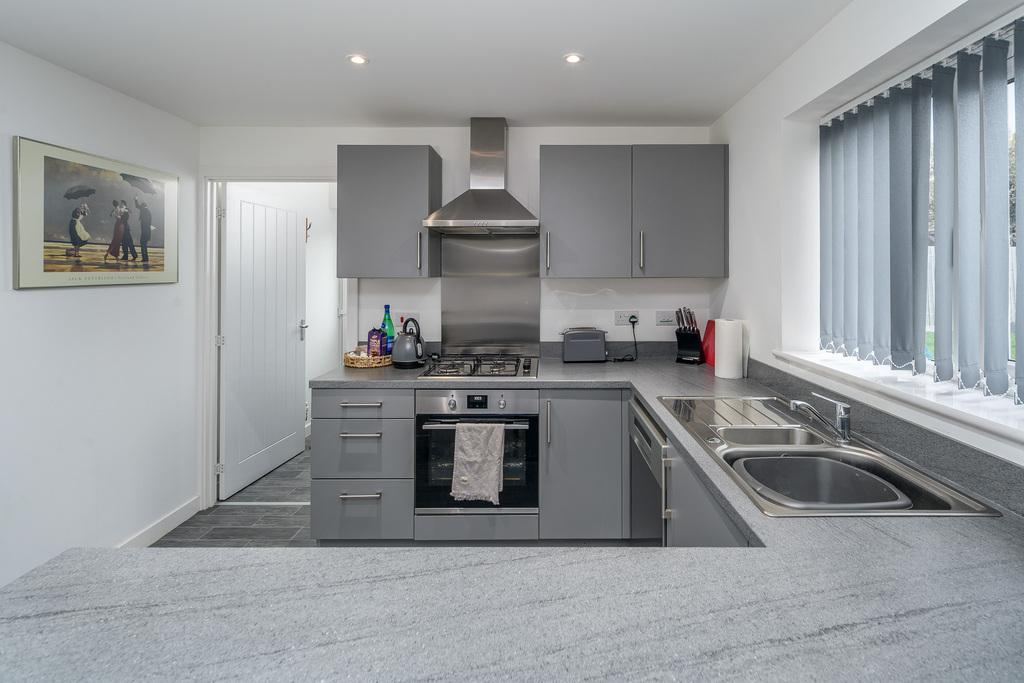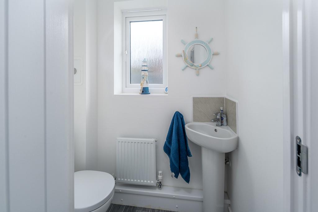 With French doors which open out to a patio ideal for al fresco dining, the kitchen-diner is a spacious and sociable room appealing to modern living. There is plenty of space to sit and dine in front of the French doors before the room transitions from carpet to grey wood effect vinyl flooring signalling entry to the kitchen which offers a good number of wall and base units with a matt grey door complemented by a contrasting grey laminate work surface. There is an under-bench oven beneath a four-burner gas hob, a stainless-steel splash back, a chimney style extractor fan and a bowl and a half stainless steel sink with a drainer to the side. Furthermore, there is a free-standing dishwasher and a fridge, and a window provides uninterrupted views over the rear garden. Adjacent there is a utility room, with matching base units to those within the kitchen, which offers space and plumbing for a washing machine and a tumble dryer and houses the boiler for ease of access. A composite door opens to the rear and a further door leads to a ground floor WC which comprises a close coupled toilet with a push button flush and a corner hand wash basin with a tiled splash back behind. A window overlooks the rear and additional lighting is by way of a pendant light fitting.
