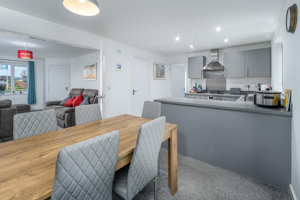 The attractive lounge is beautifully light and bright and offers plenty of space to accommodate a variety of comfortable furniture before a slate hearth with an electric feature fire which forms an attractive focal point. A window overlooks the front of the property and allows a wealth of natural light to circulate. A pair of double doors open into the kitchen-diner which is located to the rear of the property.