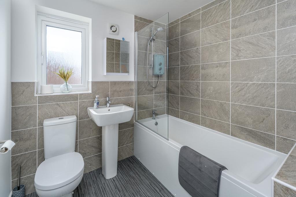 The family bathroom comprises a close coupled toilet with a push button, a pedestal hand wash basin with a chrome mixer tap, an extractor fan, a wall mounted mirrored cabinet and a bath with an electric shower over behind a glass pivot screen. Natural light enters via a window to the rear illuminating the attractive tiling and a radiator ensures added comfort.
