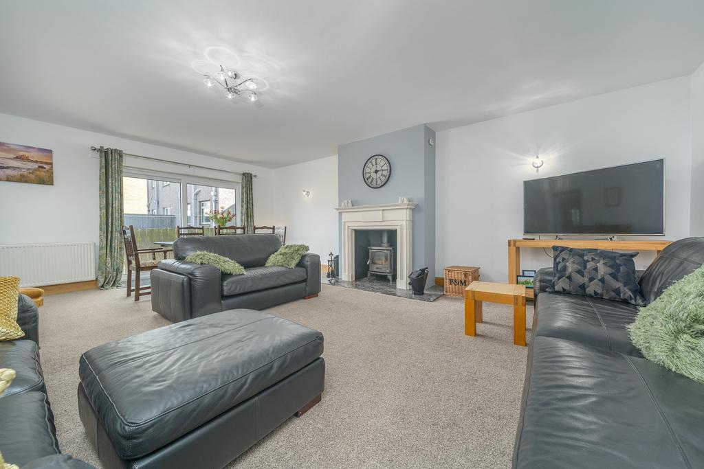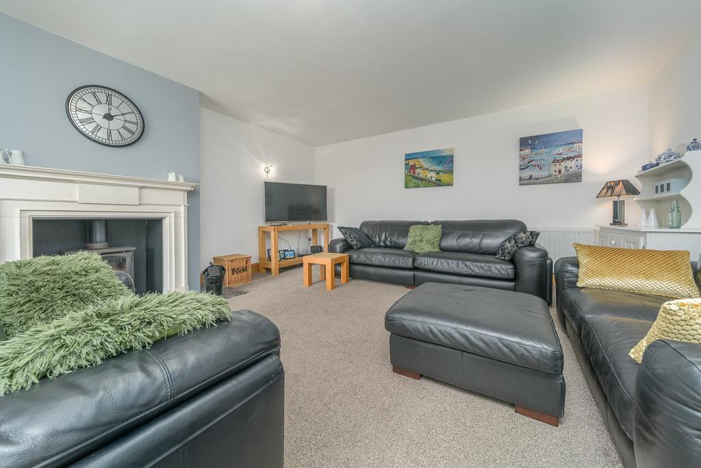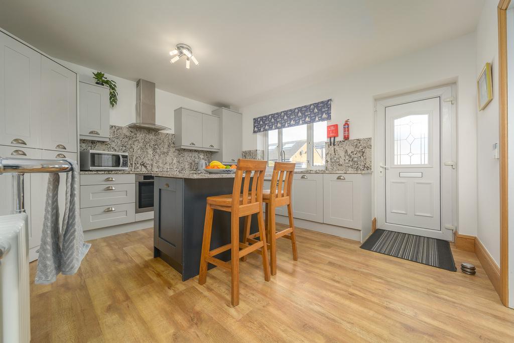 The uPVC front door opens into a superbly well designed and equipped kitchen which boasts a centre island with seating. There are a good number of wall and base units with a light grey shaker style door and a dark grey door within the centre island complemented by a natural-toned granite work surface with a large up stand extending to the windowsill which creates a stunning look. In terms of fitted equipment, there is a washing machine, a fridge-freezer, a full-sized dishwasher, a four-burner ceramic hob, an AEG under bench electric oven beneath a chimney style extractor fan, a pull-out waste container and a twin Belfast sink beneath a window which captures views to the front. The gas boiler is housed in a wall unit for ease of access and there is a bank of tall larder units adding further storage one of which is a beneficial pantry with a granite work surface and switches and sockets including USB ports. The space is finished with wood-look laminate flooring which complements the units perfectly and the traditional towel rail radiator is a further attraction.