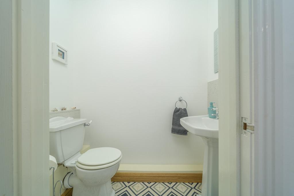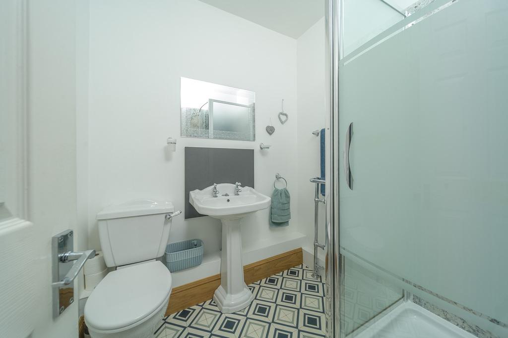A door leads from the lounge-diner back to the kitchen and then into the internal hallway with stairs, with storage beneath, ascending to the first floor and various doors leading off one of which providing external access to the rear of the property. Natural light enters via a window, with a granite sill, illuminating the space perfectly. There is a useful storage cupboard housing the electrical consumer unit and a further door provides convenient access to the well-placed ground floor WC. The suite comprises a Heritage-style pedestal hand wash basin and a Heritage-style toilet with a level flush, a fitted mirror and an extractor fan. The space is finished with vinyl flooring and the addition of the granite surface behind the ceramics adds elegance.