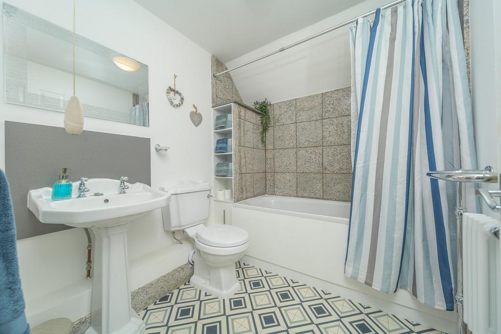 The family bathroom, with vinyl flooring, comprises a Heritage-style hand wash basin with lever taps, a close coupled toilet with a lever flush, a fitted mirror, a white bath with lever taps and a shower over and a traditional towel rail radiator ensures added comfort. The space is finished with granite tiling around the bath, sink and shower areas creating a sublime look.