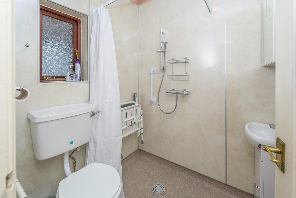 The shower room has been updated to meet the requirements of those with limited mobility. This includes wet room flooring, wet walling, a wall mounted shower with a suitably placed seat, a white vanity unit with a sink on top and a close coupled toilet with a push button behind.