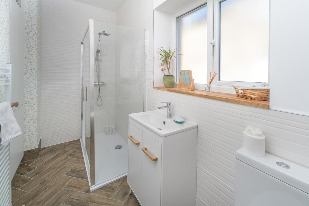 The bathroom comprises a double-sized shower cubicle with a waterfall shower head and a separate shower head within, a vanity unit with a hand wash basin on top, a close coupled toilet with a push button behind and a white painted heated towel rail. The textured tiling within the shower area and the herringbone wood-look floor tiles create a crisp and fresh finish. Natural light enters via a window, with privacy glass, and ceiling spotlights add brightness.