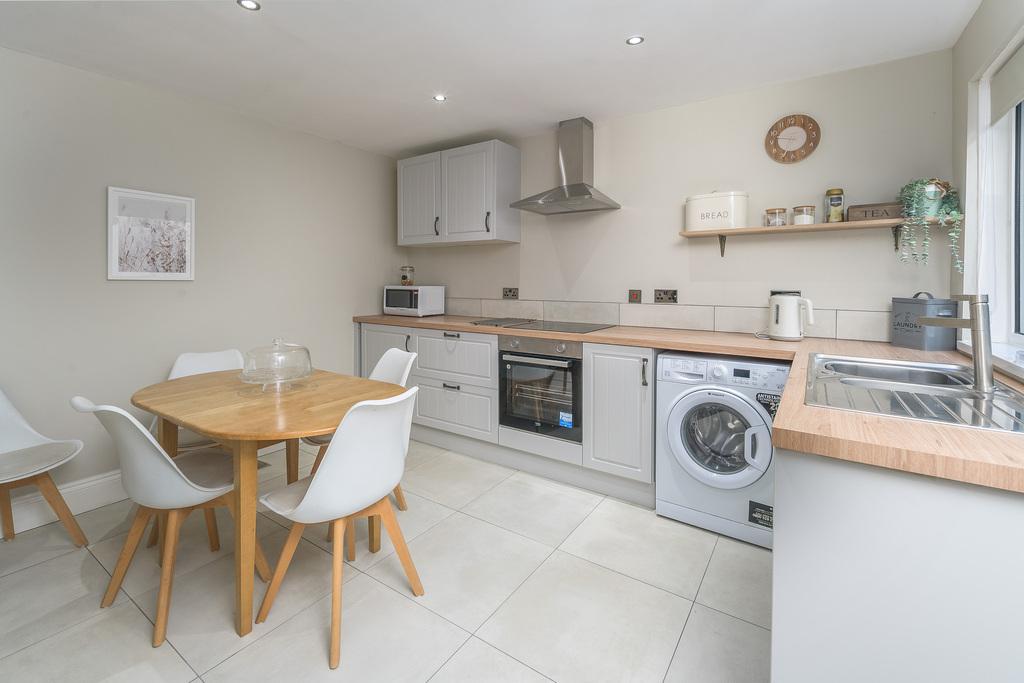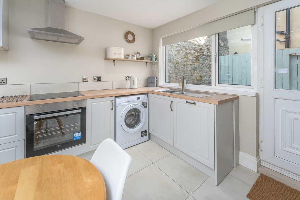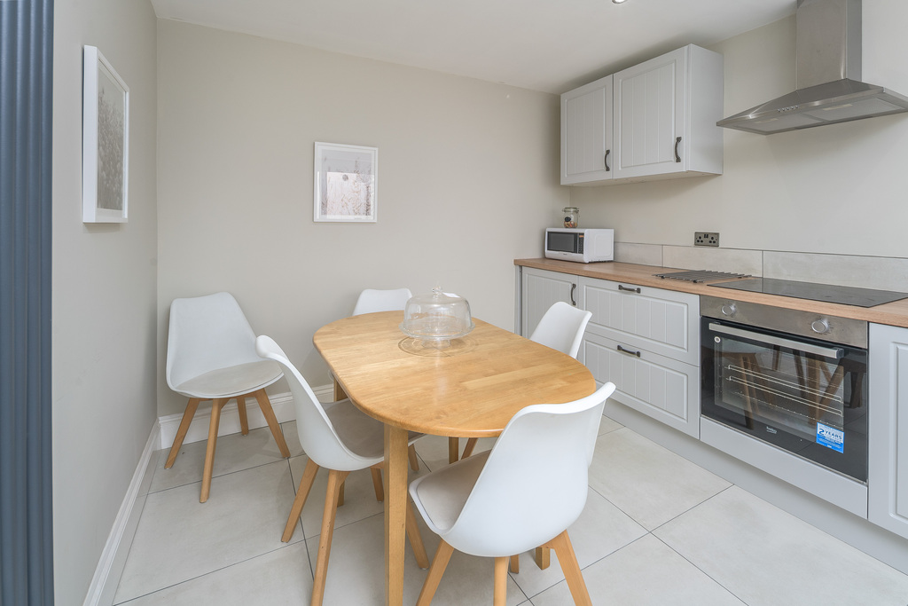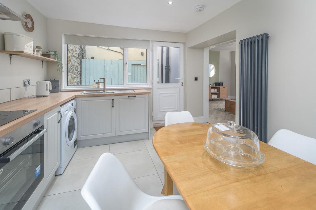 The kitchen offers a good number of wall and base units with a shaker-style door complemented by a wood-effect laminate work surface. A large window allows for natural light and a door provides external access to the rear courtyard. In terms of fitted equipment, there is a Beko four-place induction hob, an under-bench Beko oven beneath a chimney-style extractor fan, a single bowl stainless steel sink and a dishwasher. There is space and plumbing for a washing machine and a free standing fridge-freezer. The floor is finished in a sandstone-coloured tile which matches the splash back tile creating an effective look. There is plenty of space to sit and dine and a Victorian-style radiator adds charm.