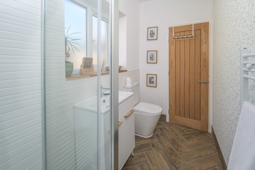Entry is via the front door into an entrance hallway with stairs leading to the first floor and one main door opening to the lounge on the left. The wood effect tiles at the foot of the stairs form both a practical and attractive finish and the décor, showcasing green hues throughout, creates a restful feel and reflects the country/coastal theme perfectly.