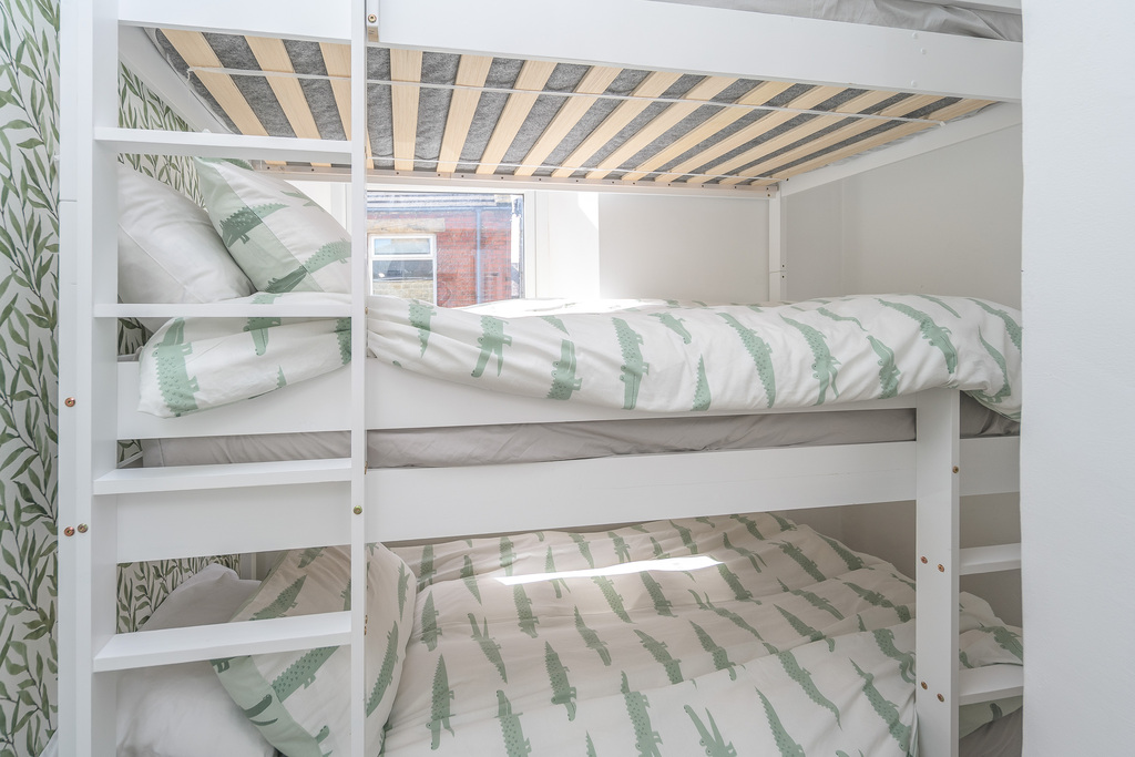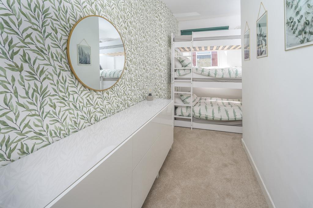Bedroom 2 is a uniquely shaped dual-aspect single room, with a low-level window, with privacy glass, overlooking the rear yard and another window overlooking the front of the house . The design of this room is such that there is plenty of space for storage options or to incorporate a home office if you so wished; it currently hosts a triple bunkbed.