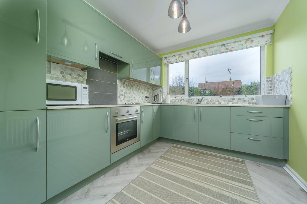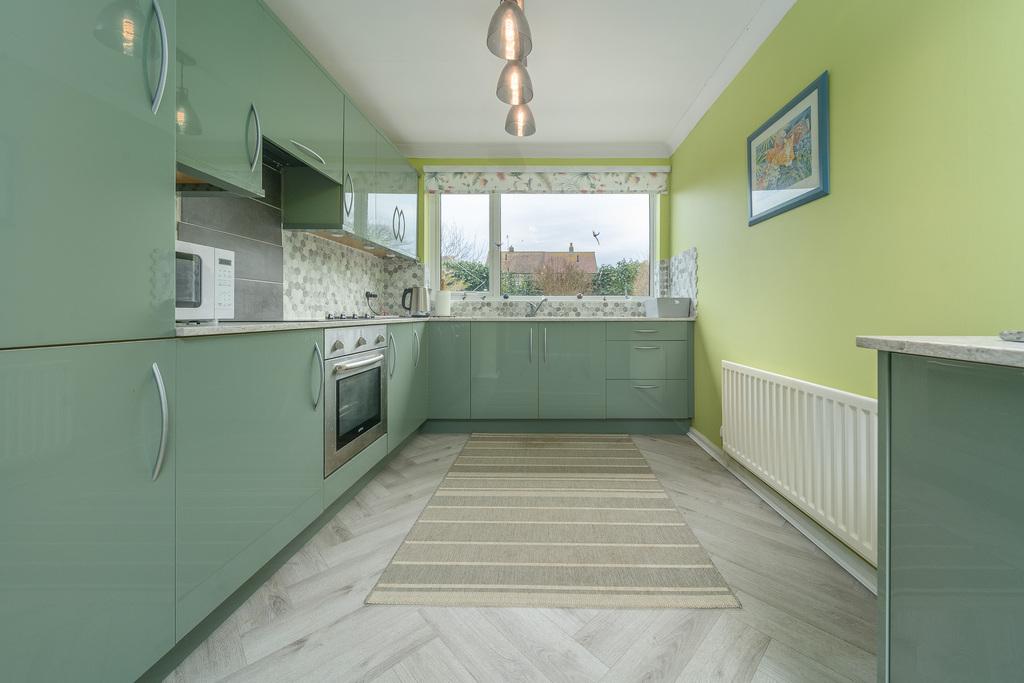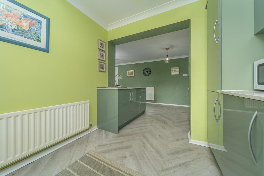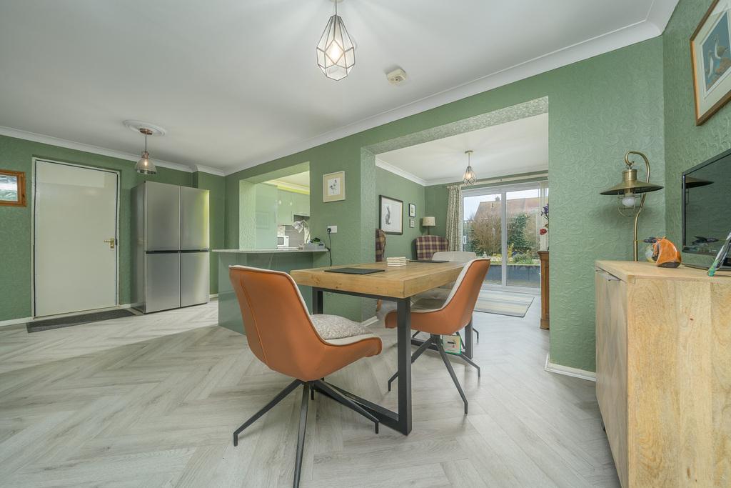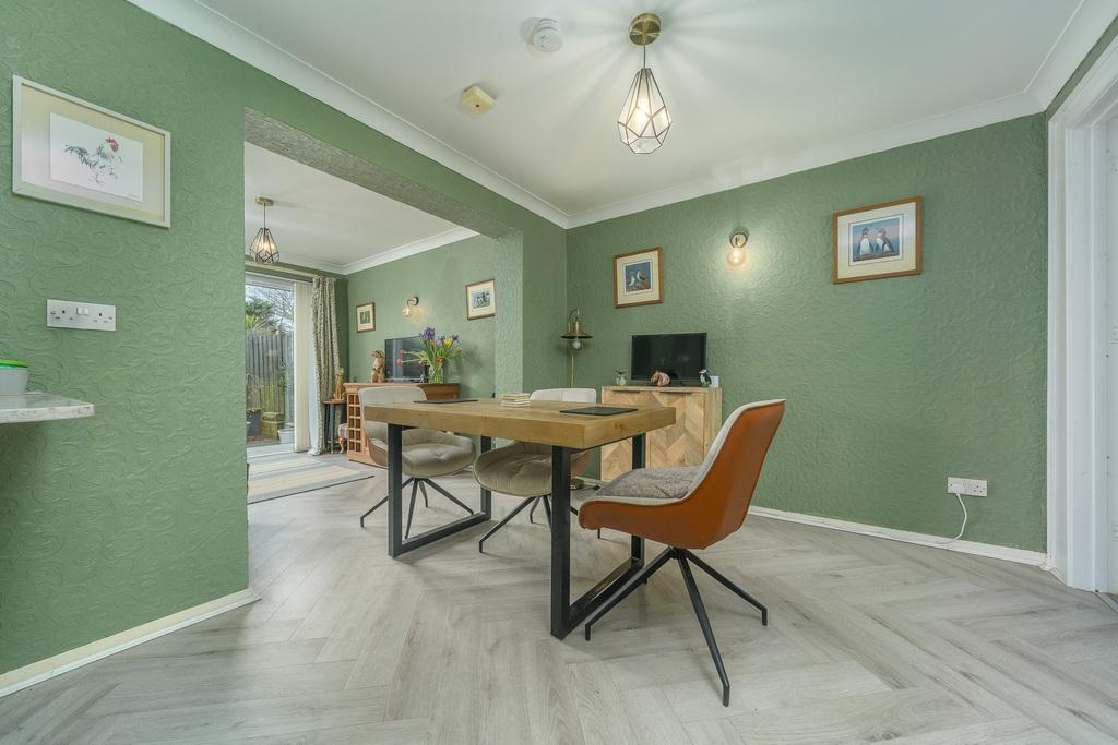 A door leads into a superb horse-shoe shaped kitchen-dining-family room extension to the rear of the property. The newly updated kitchen offers a good number of wall and base units with a high gloss sage green door complemented by a contrasting sparkly Quartz work surface which works in harmony with the hexagonal grey coloured splash back tiling and the herringbone flooring. There is a four-burner ceramic hob beneath a built-in extractor fan, an electric oven and a bowl and a half stainless steel sink beneath a large window providing uninterrupted views over the landscaped rear garden. There is space for a free-standing American style fridge freezer. The stunning Quartz work surface extends into a breakfast bar area which subtly divides the kitchen from the dining space and offers further seating. A square archway leads to a sizeable family space where there is plenty of room to accommodate a range of comfortable furniture before a set of sliding doors which open into the rear garden where there is a good-sized patio extending the width of the property which is ideal for al fresco dining with family and friends. Returning to the kitchen, a door opens into the garage which incorporates a uPVC door providing access to the rear garden: a useful point of entry and beneficial when returning from a muddy walk with a furry friend. The garage, which has been extended, offers parking for two cars and is an excellent space. It could also be used as a hobby room or a ‘man-cave’ area at one end with external access at the other.