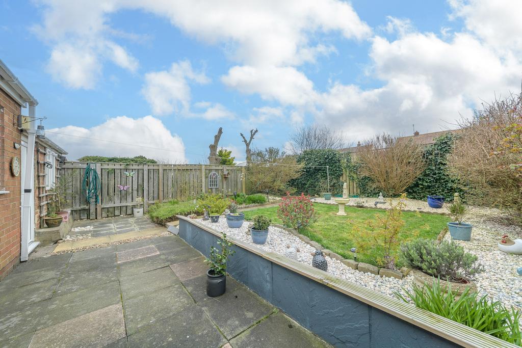 The rear garden is a relaxing outside space which is securely fenced to allow children and family pets to play safely. A patio area at the foot of the garden accessed via a path is a further attractive seating area. There are light coloured pebbled borders framing a central lawn with the addition of beautiful mature shrubs which create an attractive back drop. A uPVC door opens from the patio into the garage, with sockets, lighting and a window allowing for natural light.