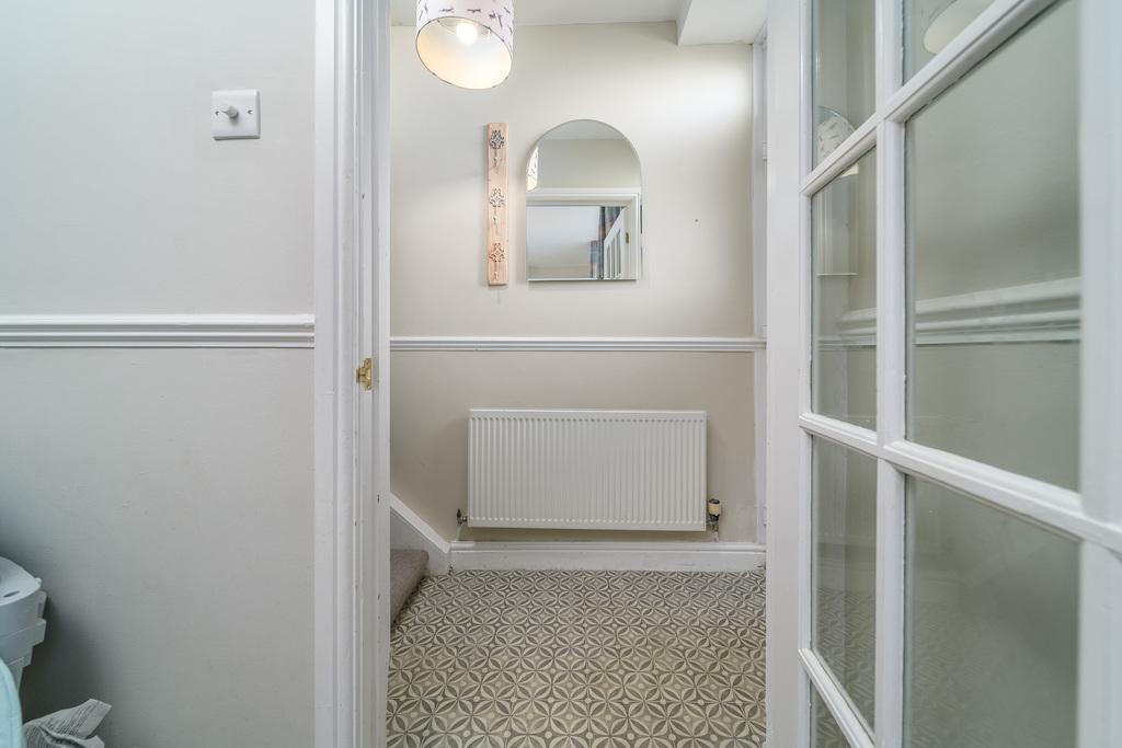 Located to the rear of the property, the kitchen-diner, with Laura Ashley grey flooring, offers plenty of space to sit and dine. There are a good number of wall and base units with a cream-coloured shaker style door complemented by a contrasting grey laminate work surface. In terms of fitted equipment, there is a Hotpoint oven, an electric hob beneath an extractor fan, a single bowl stainless steel sink and a dishwasher. There is space and plumbing for a washing machine and there is space for a free-standing fridge freezer. The room is finished with cream painted wood panelling which works in harmony with the grey walls illuminated by natural light entering via a window which overlooks the private rear courtyard.