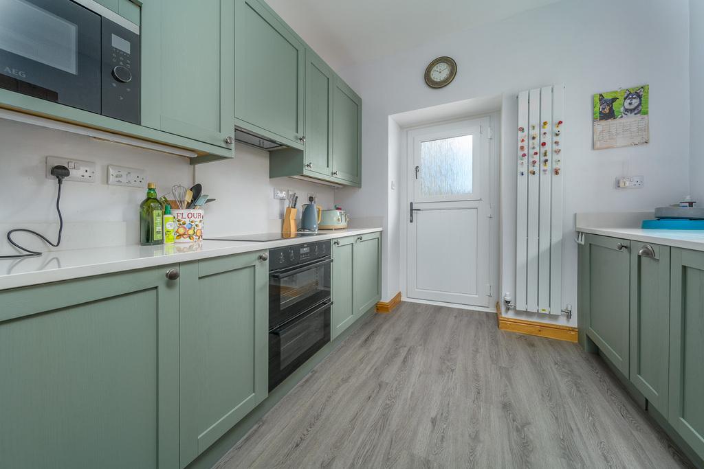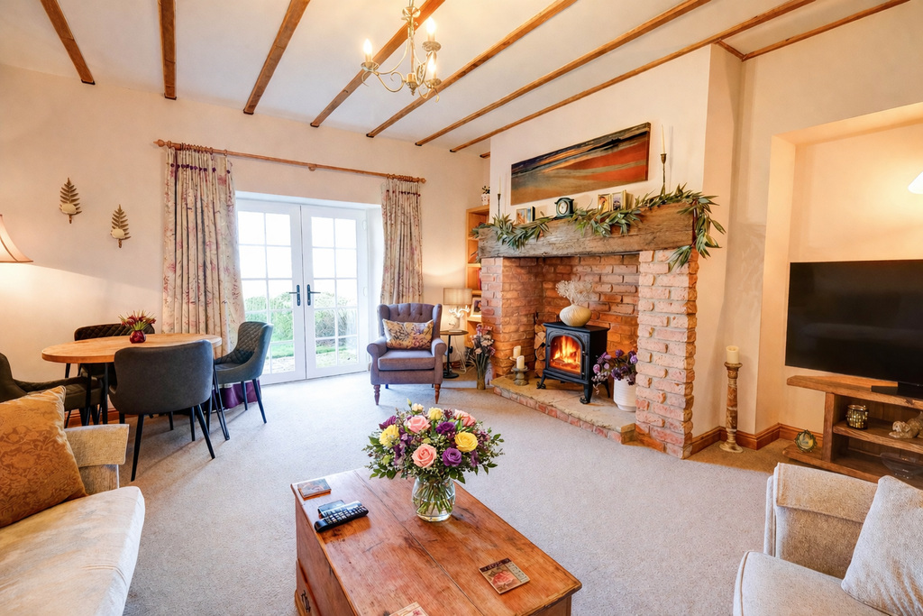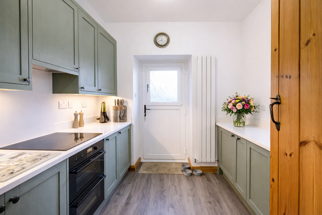 With French doors opening onto a stone laid patio within the front garden, the lounge-diner is a beautifully inviting room in which you can relax with family and friends whilst appreciating the stunning views towards the coast. A large stone fireplace housing an electric wood burner, with a railway sleeper mantle, forms an attractive focal point enticing you to sit before it during the cooler months. An exposed stone wall and exposed beams add further character to this relaxing room.