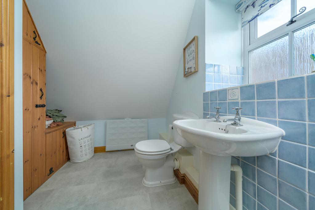 Opposite, the good-sized bathroom comprises a Heritage style close coupled toilet and hand wash basin, a white bath with Victorian style shower taps over, an electric heated towel rail and built-in storage cupboards. The room, with vaulted ceiling, is finished with seaside blue tiling which reflects the views captured by the property and completed with stylish vinyl flooring creating a crisp and fresh look.