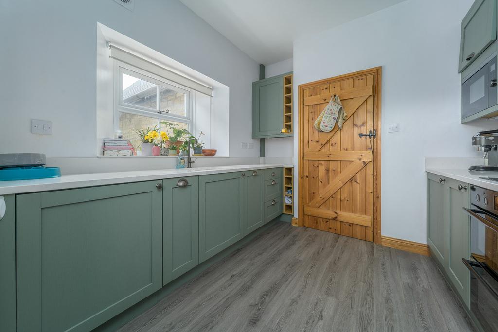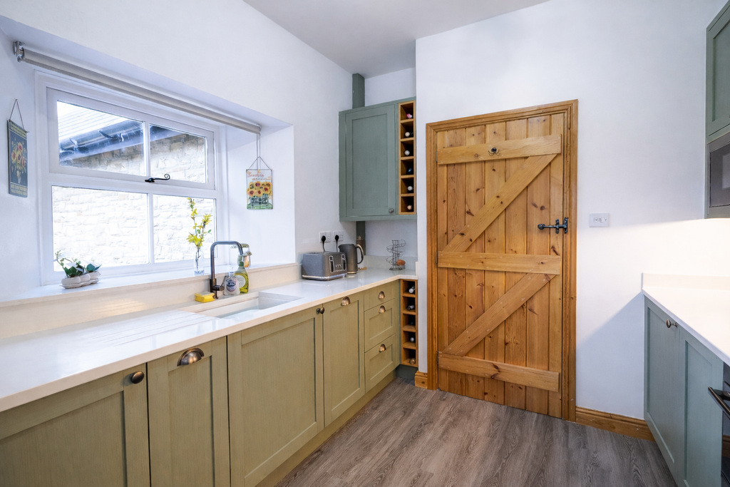 Country cottage in style the well-equipped kitchen offers a good number of wall and base units with a sage-green coloured door complemented by a light-coloured Corian-style work surface. In terms of fitted equipment, mainly AEG, there is a four burner induction hob beneath a built-in extractor fan, an under-bench oven, a microwave, a ceramic sink dropped into the work surface with a pewter coloured tap above, a washing machine, a dishwasher, an under-bench freezer and an under bench fridge. A window, with a deep sill, allows for plenty of natural light to enter and a designer-looking white radiator completes the look. A white uPVC stable door provides external access to the courtyard at the rear.