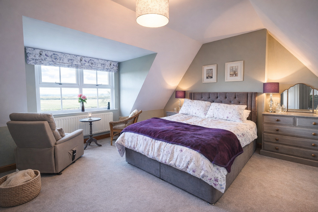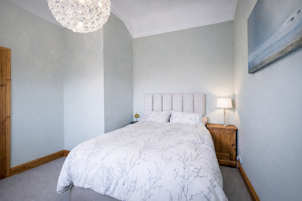 The ground floor bedroom takes advantage of the glorious views to the front of the property. There is a high-level cupboard above offering excellent storage. The bedroom is adjacent to a shower room, with attractive tiled floor, which comprises a large shower cubicle with a water fall shower head and a separate shower head within behind a bi-fold door, a pedestal wash hand basin, a Heritage-style close coupled toilet and a white heated towel rail ensures added comfort. The space is finished with natural stone coloured tiling which creates a warm and comfortable feel.