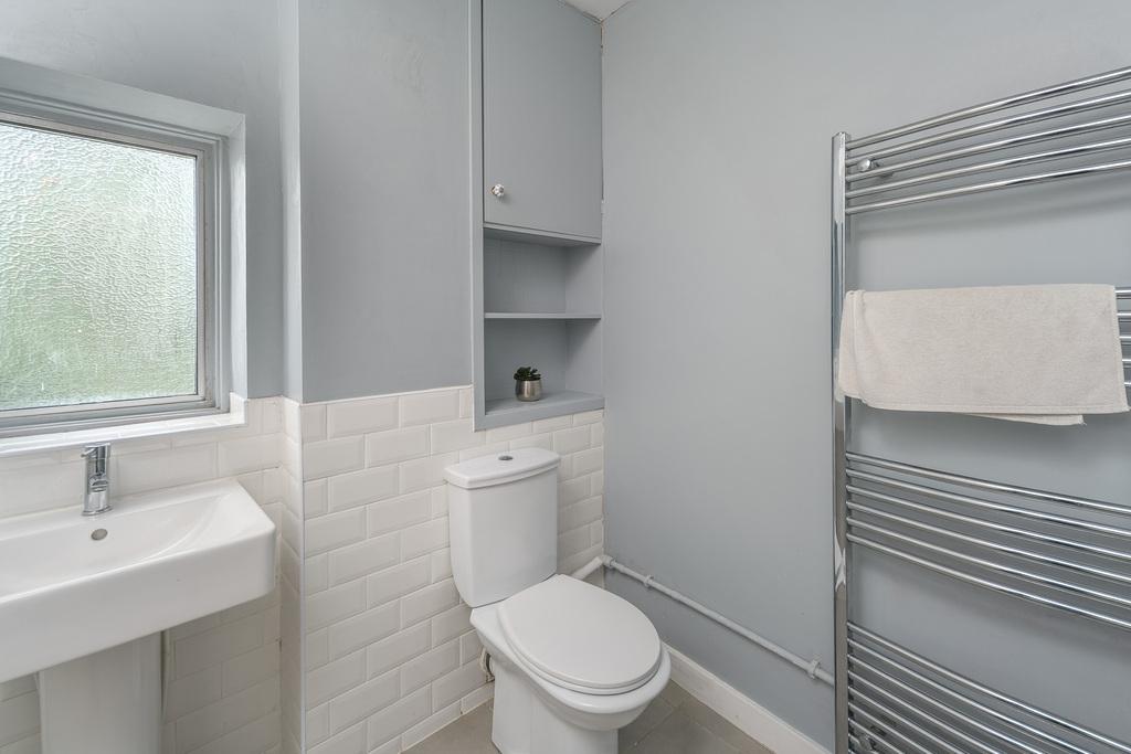 The spacious family bathroom comprises a close coupled toilet with a push button, a large square pedestal hand wash basin and a white bath with an electric shower over with white brick style tiling within behind a glass shower screen. A chrome heated towel rail ensures added comfort, a window allows for natural light and grey floor tiles complete the look.