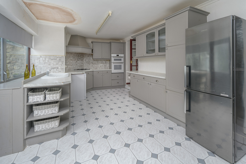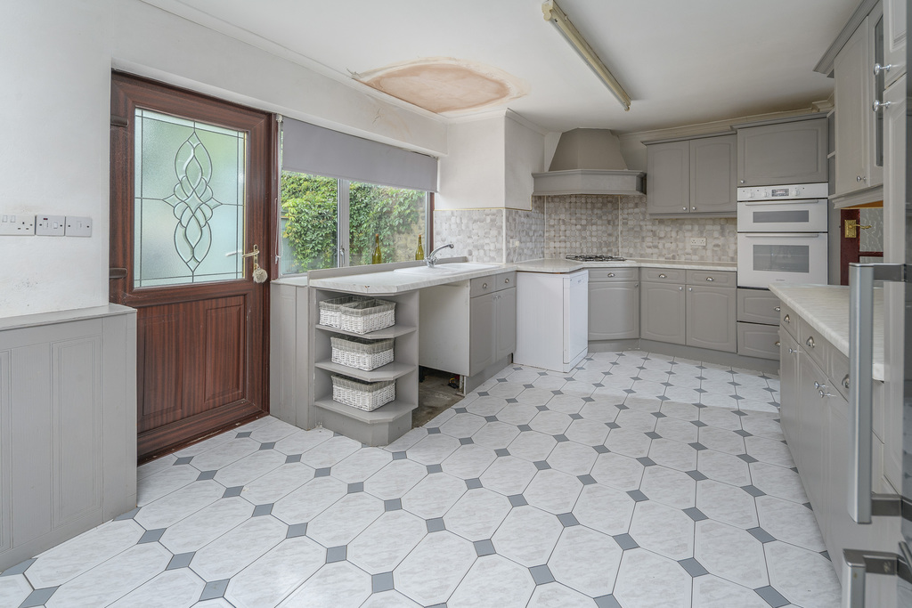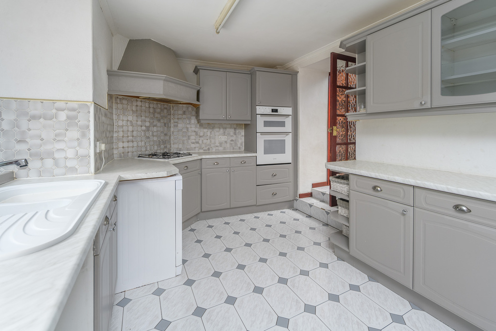The kitchen-diner is accessed via a couple of steps down and through a wood and glass door. There are a good number of wall and base units with a grey painted door complemented by a light-coloured marble-look work surface. There is a four-burner gas hob beneath a built-in extractor fan, an eye level combination oven and grill and a bowl and a half white acrylic sink. There is space and plumbing for a dishwasher, a washing machine and a free-standing fridge-freezer in addition to ample space to accommodate a dining table and accompanying chairs. Two large windows provide uninterrupted views over the lovely rear garden and a door provides external access.