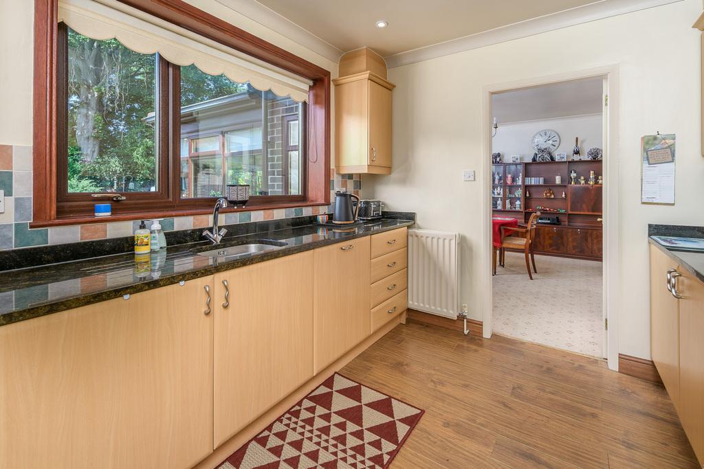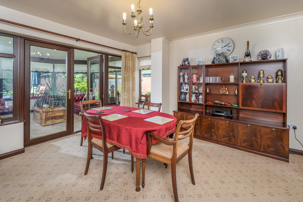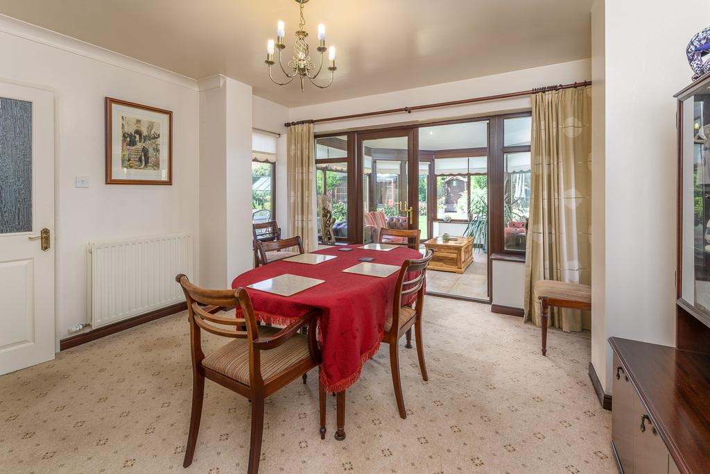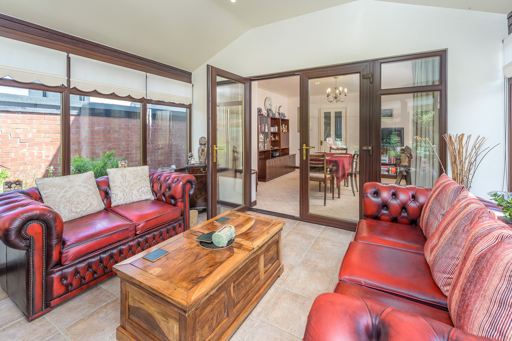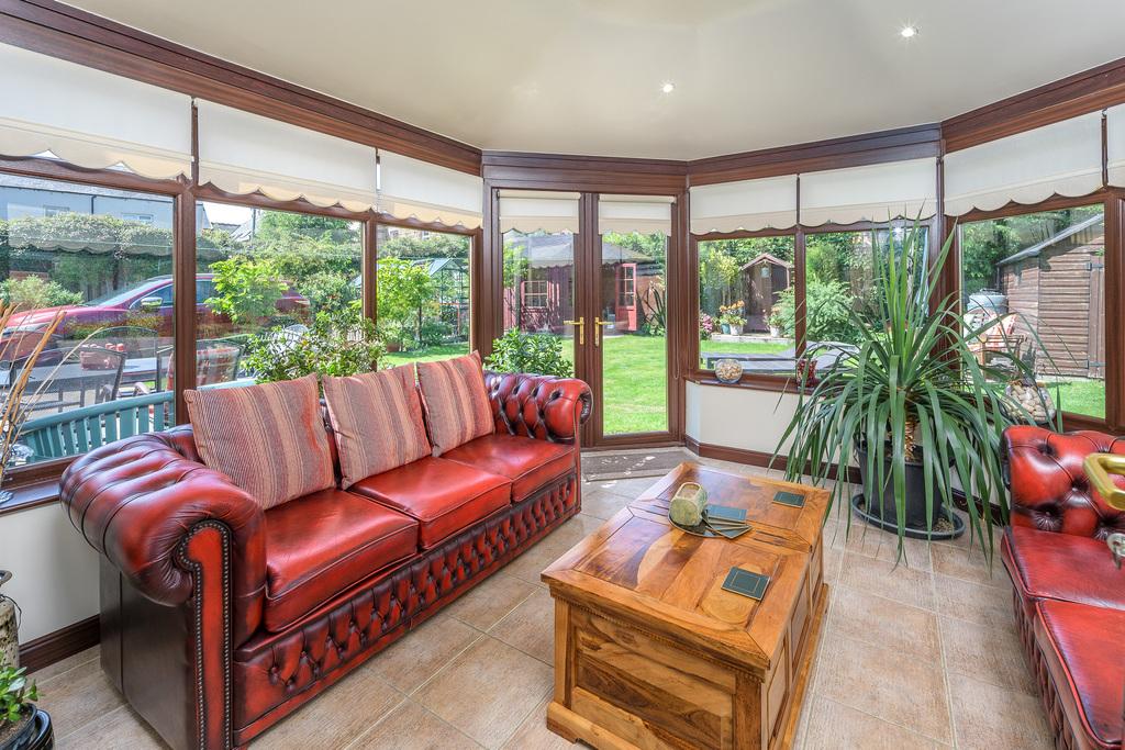 The dining room, with two large windows, is spacious and airy and can comfortably accommodate a dining table and accompanying chairs. Again, the neutral tones allow the addition of accent colour should you so wish. This room features French doors which open into a large conservatory with a riven tiled floor. This restful and relaxing room offers further comfortable living with a solid roof enabling the space to be used throughout every season: an ideal place in which to while away the hours enjoying the lovely garden views entering through the many windows and French doors which open out into the garden onto a paved area ideal for al fresco dining during the warm summer months.