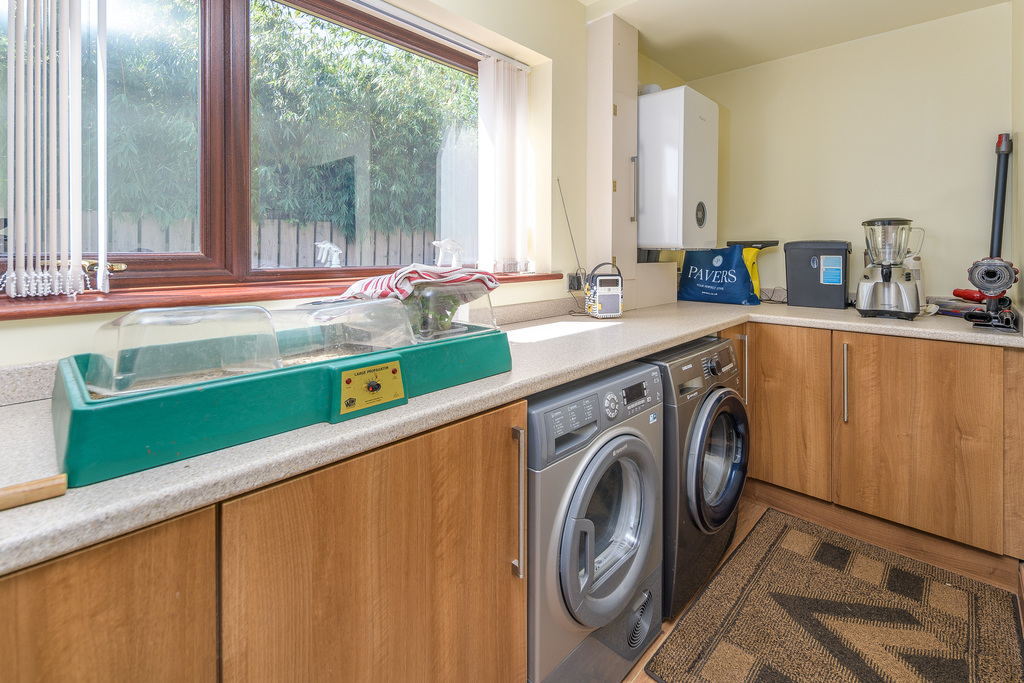 Opposite, a door opens to the converted garage. This room, with a window overlooking the side of the property and one taking advantage of views to the front, is a superb multi use space which is currently utilised as a utility room and office. There is space for a free-standing fridge-freezer, plenty of wall and base units with a wood effect door complemented by a light-coloured laminate work surface, space and plumbing for a washing machine and space for a tumble dryer. In addition, there is shelving above a desk area. The boiler is housed in a wall unit for ease of access and there is loft storage available.