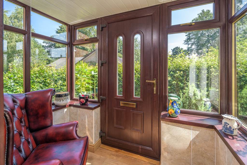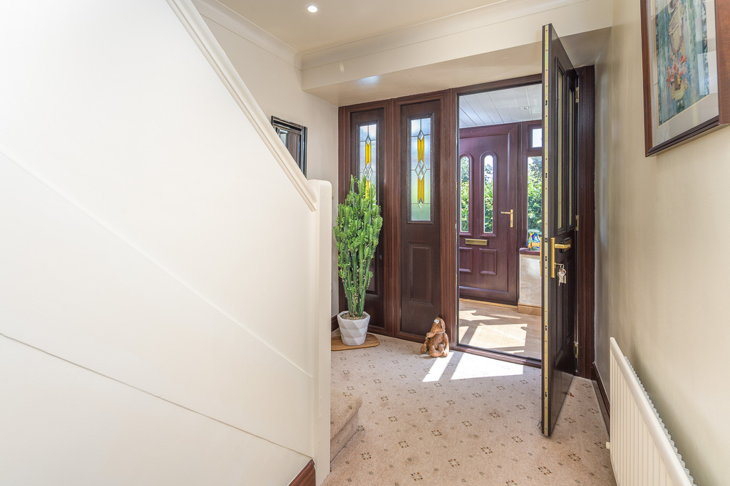 A wrought iron gate opens to the driveway which leads to the front door. A beech hedge affords a good element of privacy in addition to forming a lovely outlook enjoyed from the rooms to the front of the property. The front door opens into a useful entrance porch which is sizable, light and bright and has been finished with tiled walls and oak-effect laminate flooring. The main entrance hallway is entered from here via a wood and glass door with glass panels to side allowing a good amount of natural light to circulate. Stairs, with beneficial storage beneath, ascend to the first floor and various doors lead off. The space is neutrally decorated to allow the easy addition of accent colour should you so wish.