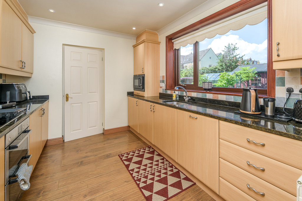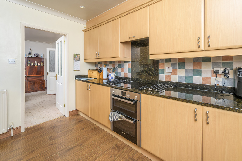 Located to the rear of the property, the kitchen offers a good number of wall and base units with a beech wood effect door with brushed chrome furniture complemented by a dark coloured granite work surface with matching up stand and attractive square splash back tiling. In terms of fitted equipment, there is a Bosch four-ring induction hob beneath a granite splash back, a Bosch double oven, a Kenwood microwave oven, a single bowl stainless steel sink with a mixer tap above, an under-bench fridge and a Bosch dishwasher. The flooring is finished with dark coloured laminate which works in harmony with the granite surfaces. A large window allows for natural light and provides uninterrupted views over the rear garden.