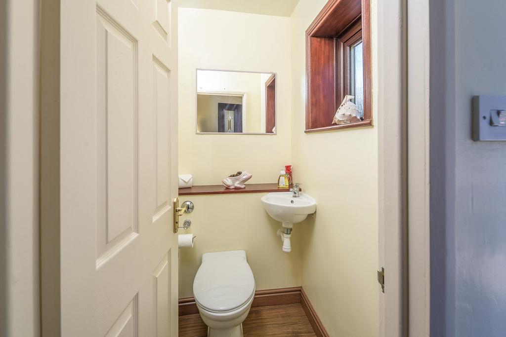 The far end of the kitchen leads to an inner hall which offers a good-sized storage cupboard and a door providing external access to the rear garden. To the left of the external door, there is a conveniently placed ground floor WC which comprises a concealed cistern toilet with a push button behind and a shelf above, and a wall hung hand wash basin with a mixer tap above. A radiator ensures added comfort. A window, with privacy glass, overlooks the rear of the property with ceiling spotlights adding brightness.