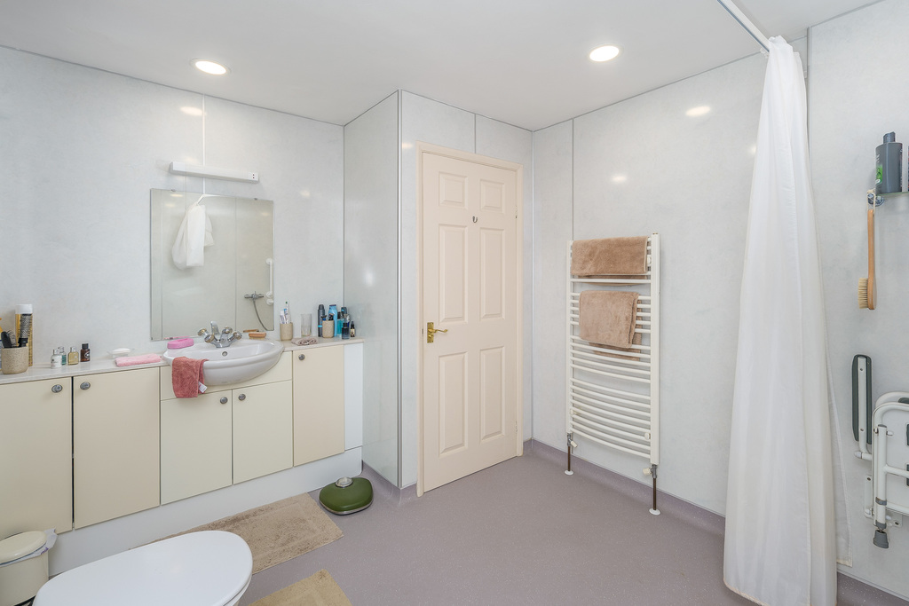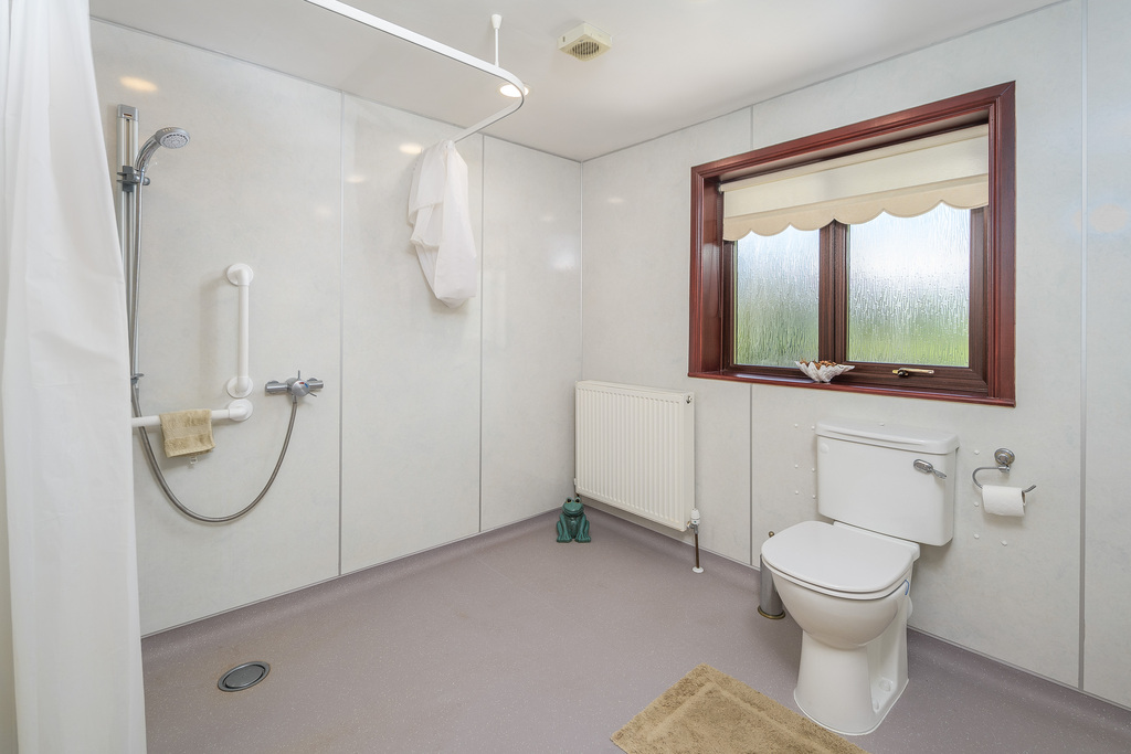The family bathroom is configured as a wet room and comprises a cream vanity unit with a semi-recessed hand wash basin with a chrome mixer tap and a mirror above, a shaver socket, a close coupled toilet with a push button behind, an extractor fan, a walk in shower, with the addition of a seat for those with limited mobility, and a shower within behind two shower curtains. A cream heated towel rail ensures added comfort. Two windows, with privacy glass, overlook the rear of the property and allow a wealth of natural light. Additional lighting is by way of ceiling spotlights.