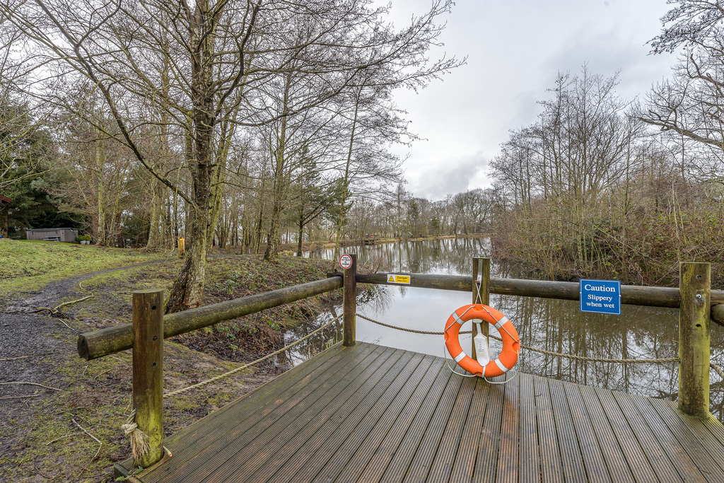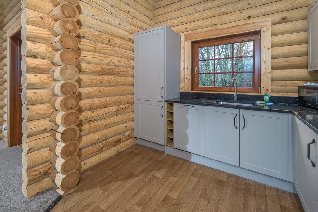 The spacious kitchen offers plenty of wood-effect wall and base units with a mushroom-coloured door complemented by a sparkly granite work surface with matching upstand. In terms of fitted equipment, there is a dishwasher, a fridge-freezer, a gas hob beneath a stainless steel and glass chimney-style extractor fan above, an under-bench oven and a stainless-steel Belfast-style sink with a drainer cut into the side beneath a window capturing views of the lake. The boiler is housed in the kitchen for ease of access and the space is finished with quality LVT flooring.