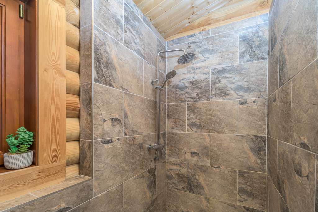 The spacious shower room comprises a close-coupled toilet with a push button above, a vanity unit with a sink on top and a shower cubicle with a waterfall shower head and a single shower head within. The room offers attractive tiling to the floor and café latte coloured tiling around the sink and shower areas. A window allows for natural light.