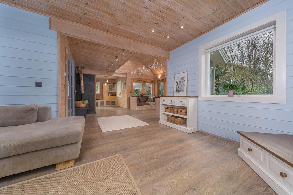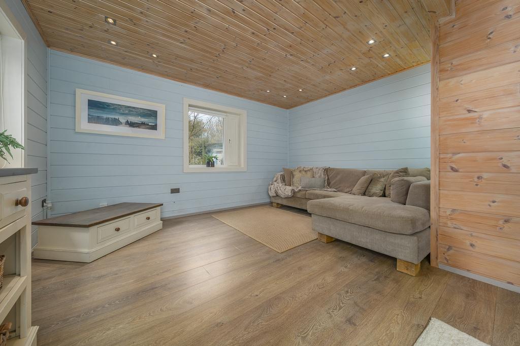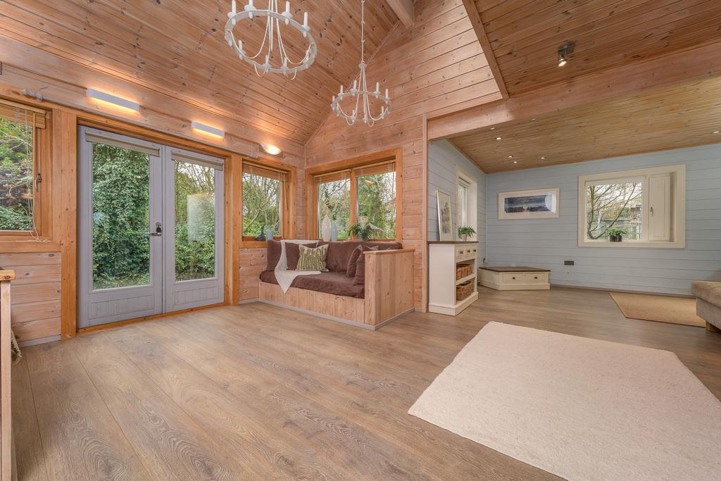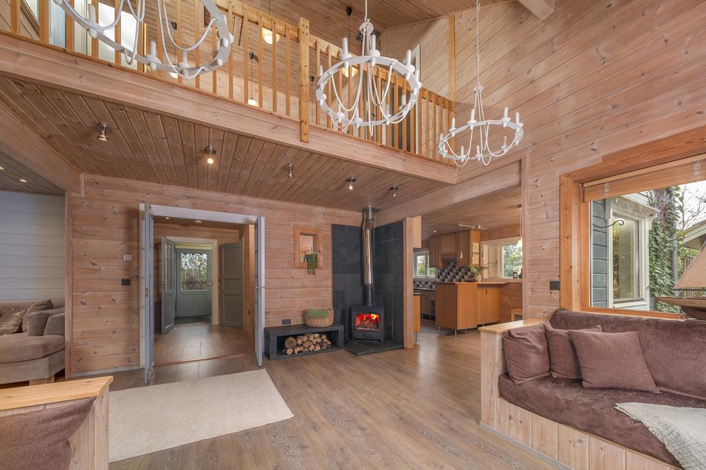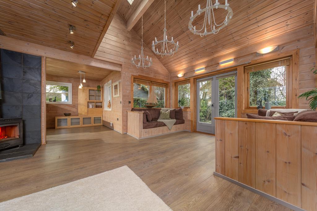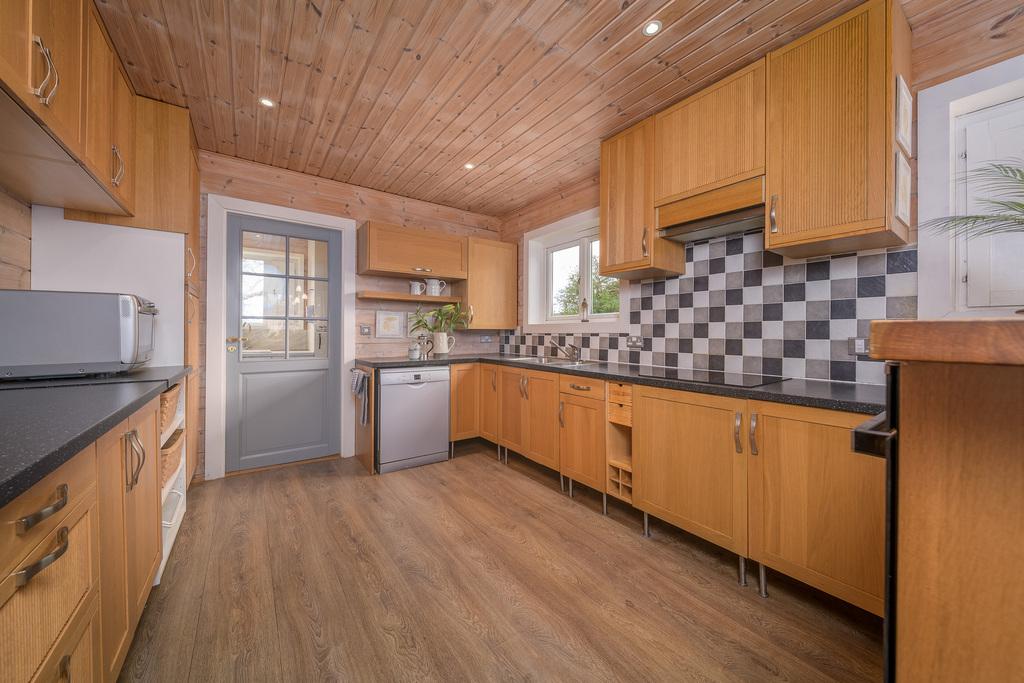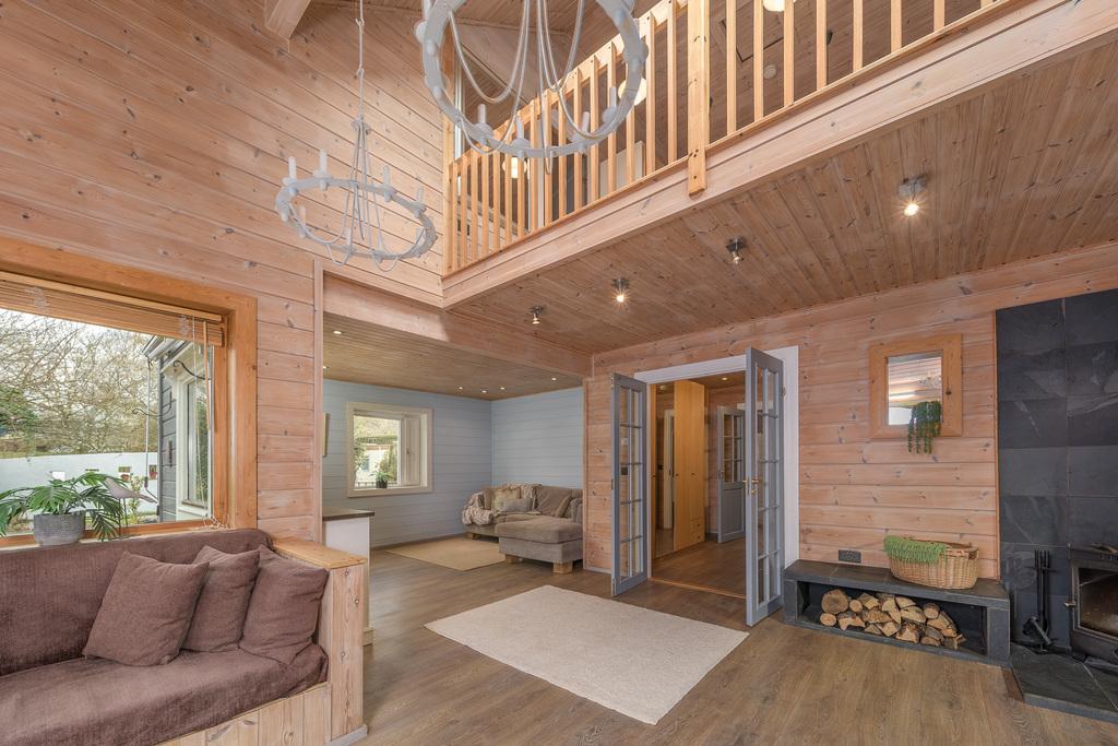 Open plan and spacious, the kitchen-dining-sitting room is a superb room appealing to modern living with a pair of double doors opening onto a decked area at the rear facilitating free flow of movement between indoor and outdoor living. This impressive room incorporates a mezzanine level, with Velux windows, which overlooks the sunroom space to the rear of the kitchen. To the right there is a lovely seating area before a window which overlooks the rear of the property and a second which window takes advantage of views to the side. A feature fireplace, housing a multi-fuel burning stove set upon a black slate hearth, forms an attractive focal point enticing you to sit before it during the cooler months. To the left, there is a built-in wood store. The room finished with a wide plank LVT flooring which extends throughout most of the ground floor creating a seamless transition between the different spaces.